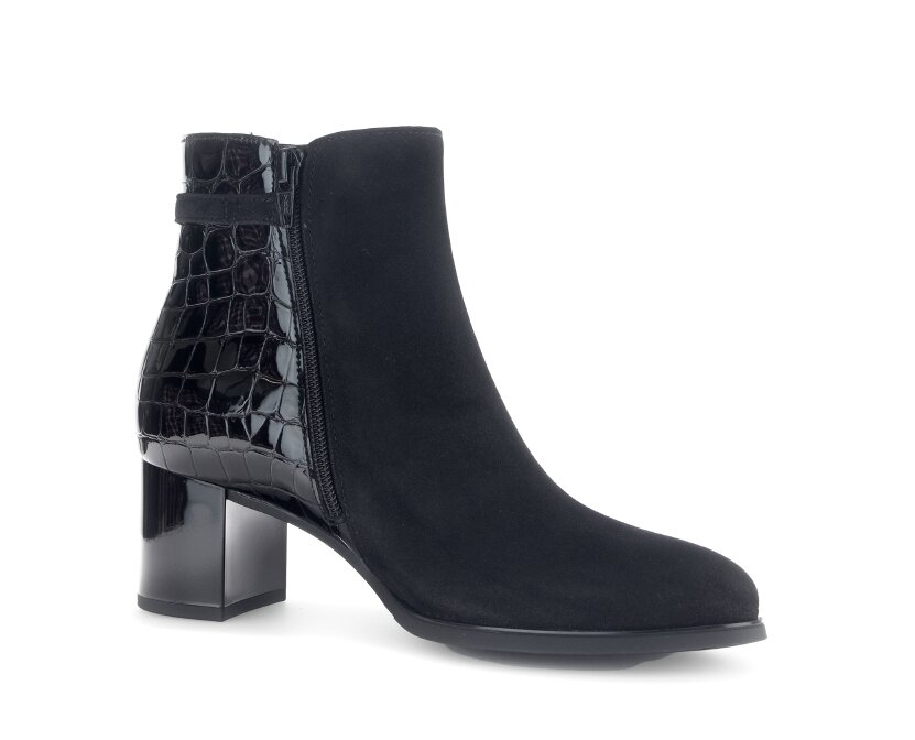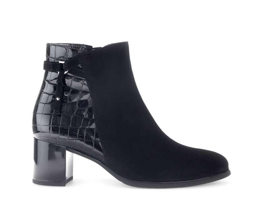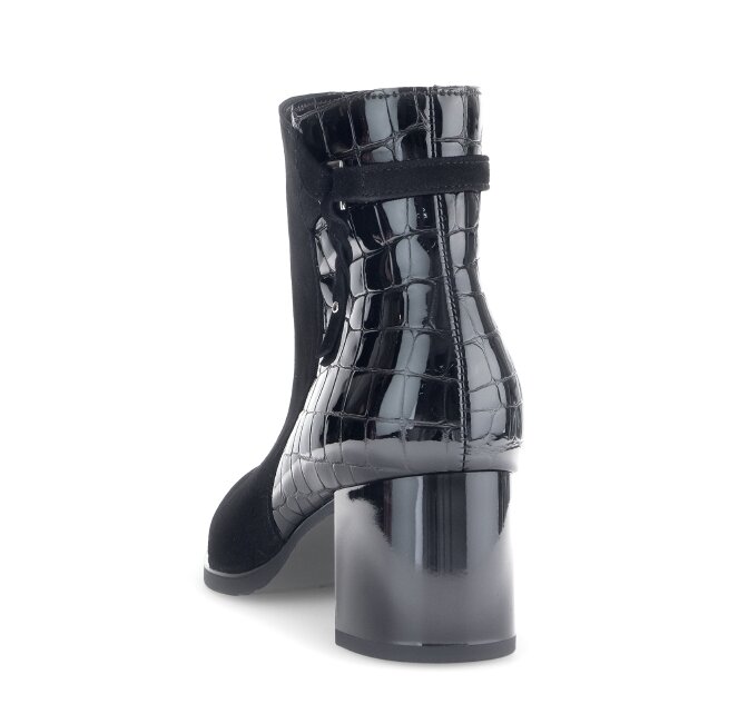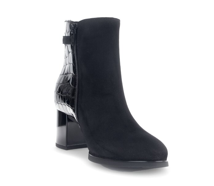 Elegantní kotníková obuv v kombinaci lakované a broušené kůže na komfortním blokovém podpatku jsou perfektním obutím pro podzimní a zimní období.