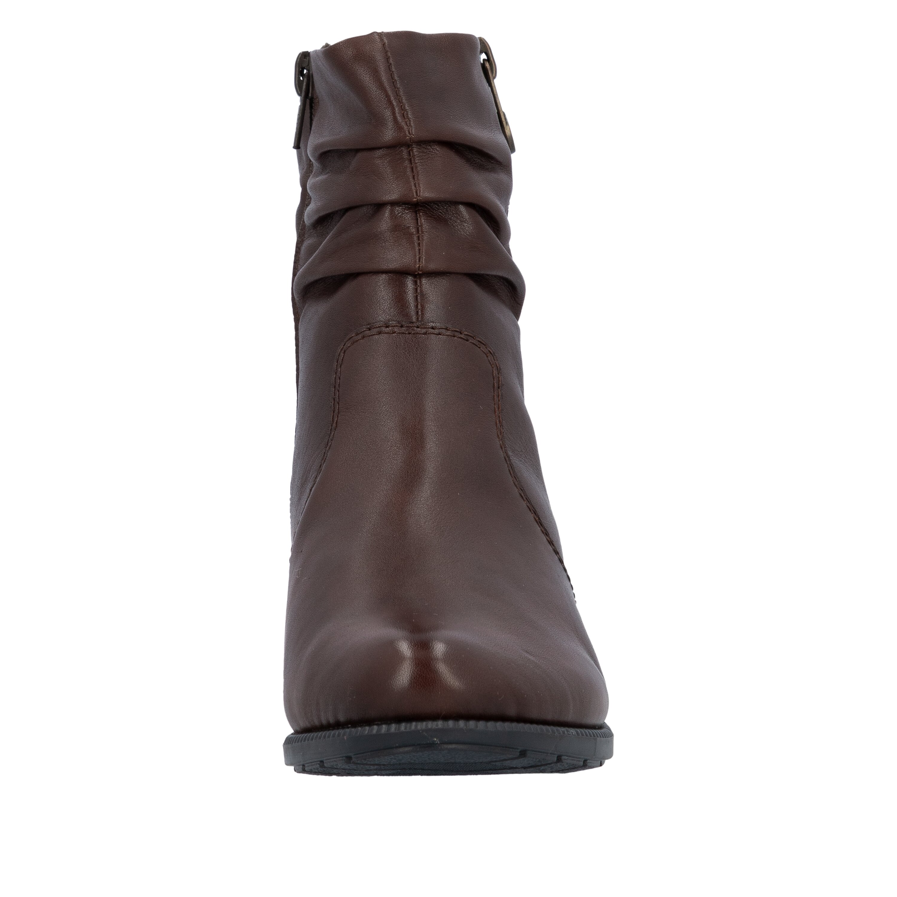 Dámská elegantní kotníková obuv na blokovém, stabilním podpatku v nadčasové hnědé barvě snadno doladí nejeden volnočasový outfit. Vrchní materiál je hladká kůže. Vnitřní materiál je textil. Stélka je vyměkčená, textilní. Obuv je v šíři F. POdešev je syntetická, flexibilní. Výška podpatku je 3,4 cm. Barva u tohoto vzoru je hnědá.