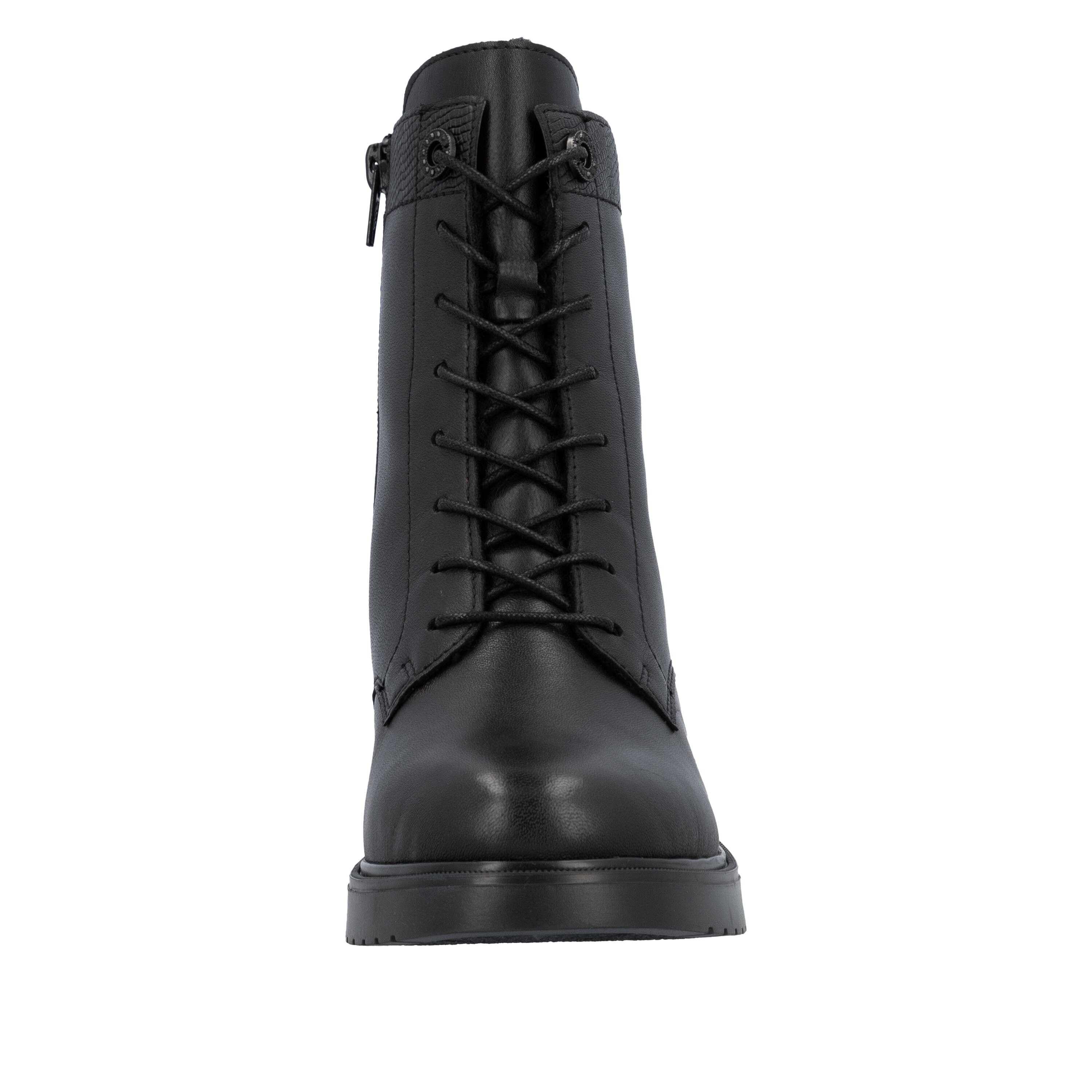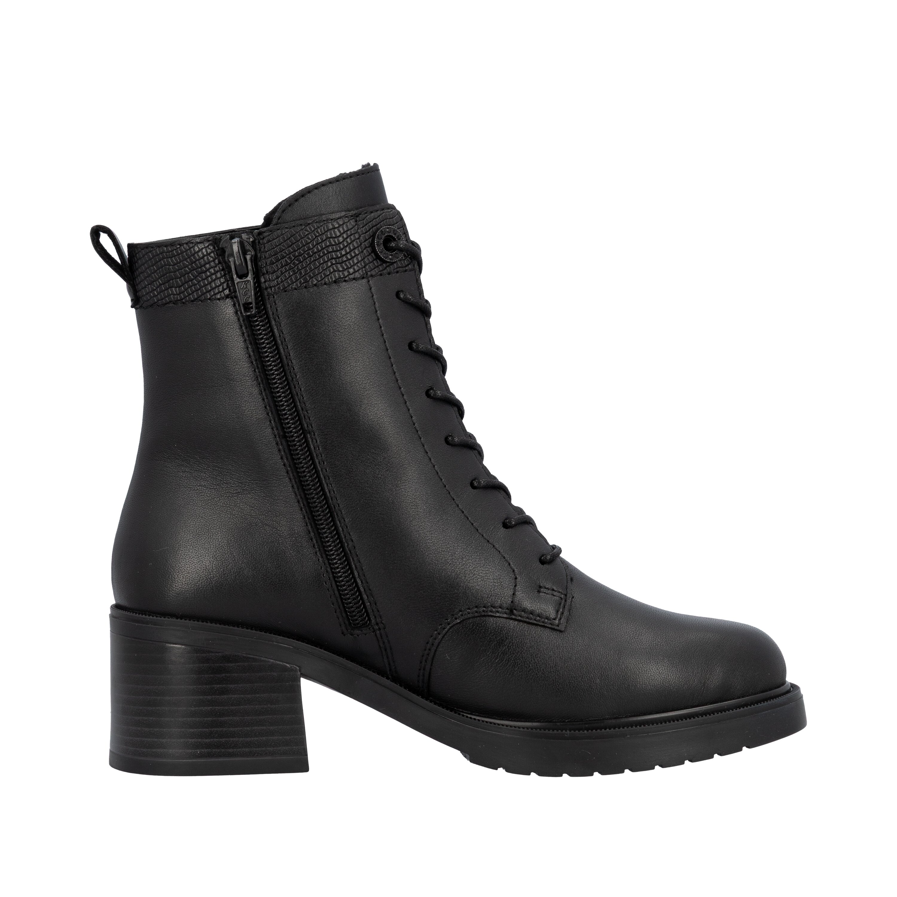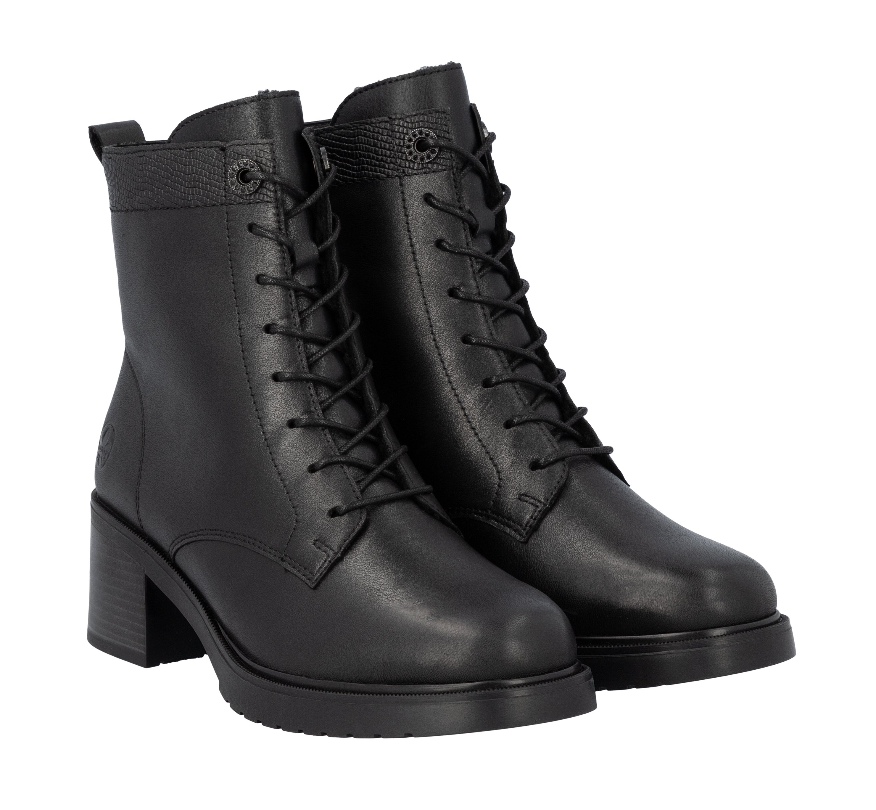 Kožená kotníková obuv v nadčasovém zpracování se zipem a šněrováním pro komfortní nazouvání na středním podpatku.