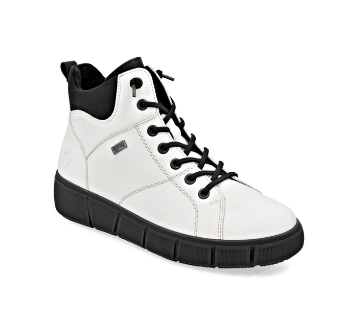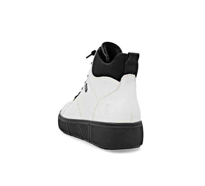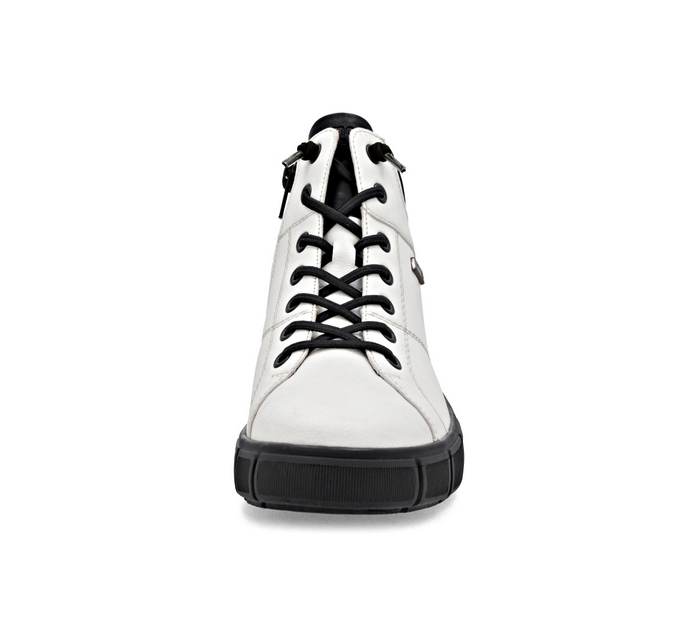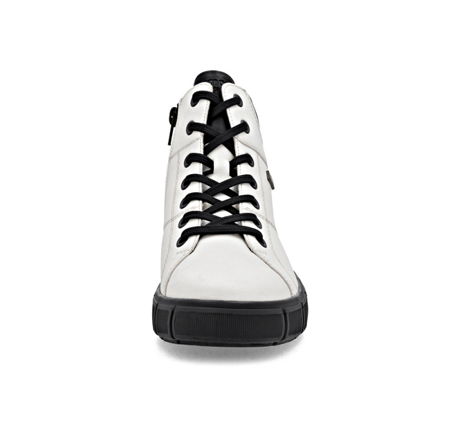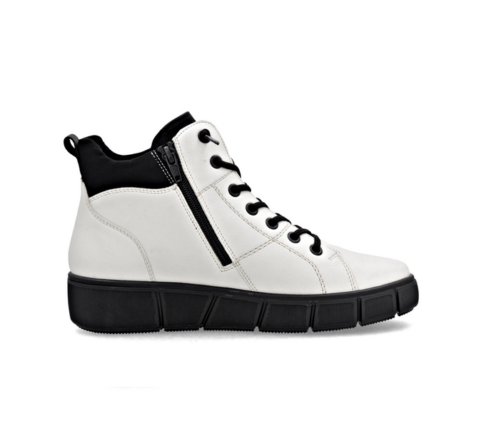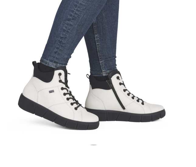 Stylové kotníkové boty v bílé barvě zaujmou moderním vzhledem i praktičností. Kožený svršek doplňuje kontrastní černý textilní lem, který dodává obuvi šmrnc. Vrchní materiál je kombinace kůže a textilu. Vnitřní materiál je textil. Stélka je vyměkčená, s remonte soft stélkou, vyjímatelná. Obuv je v šíři H. Podešev je syntetická, flexibilní. Výška podpatku je 3,9 cm. Obuv je opatřena Tex membránou. Barva u tohoto vzoru je bílá.