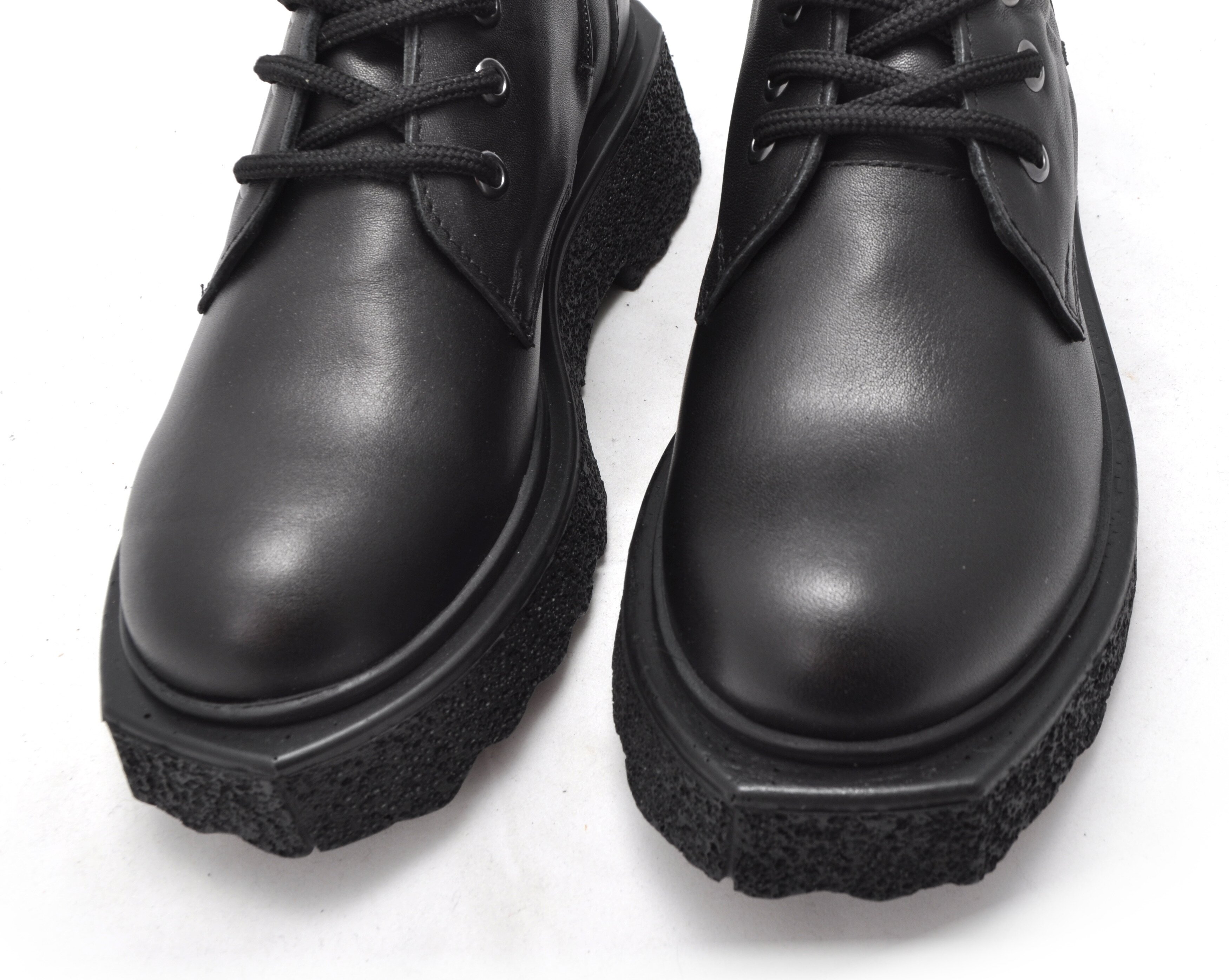 Stylová, kotníková obuv se zapínáním na zip z vnitřní strany. Vrchní materiál je hladká kůže. Vnitřek obuvi je textilní s kombinací kůže, stélka je textilní (zateplená). Barva u tohoto vzoru je černá. Podešev je syntetická, flexibilní. Výška podešve je cca 2 cm, výška podpatku je cca 4,5 cm.