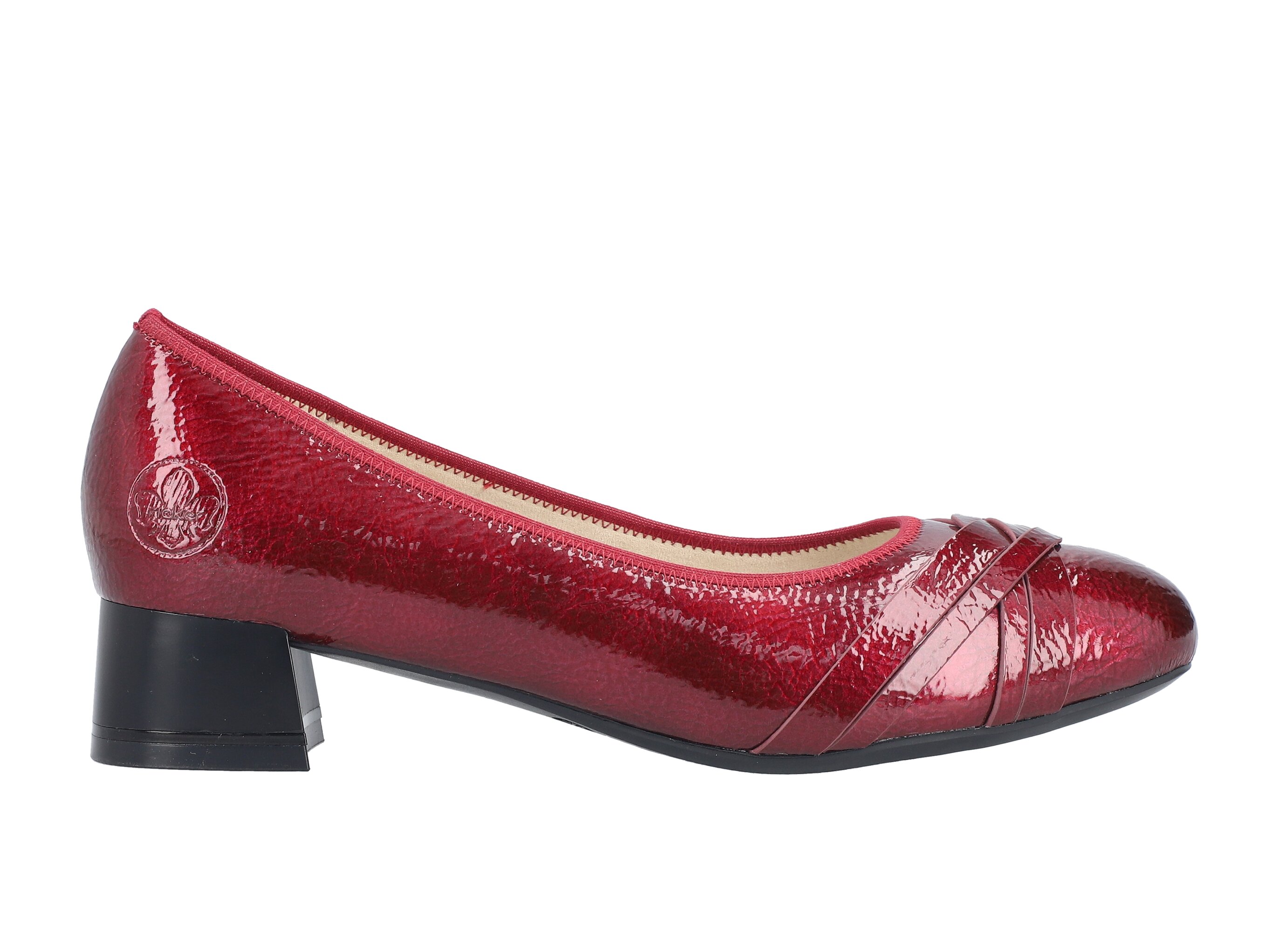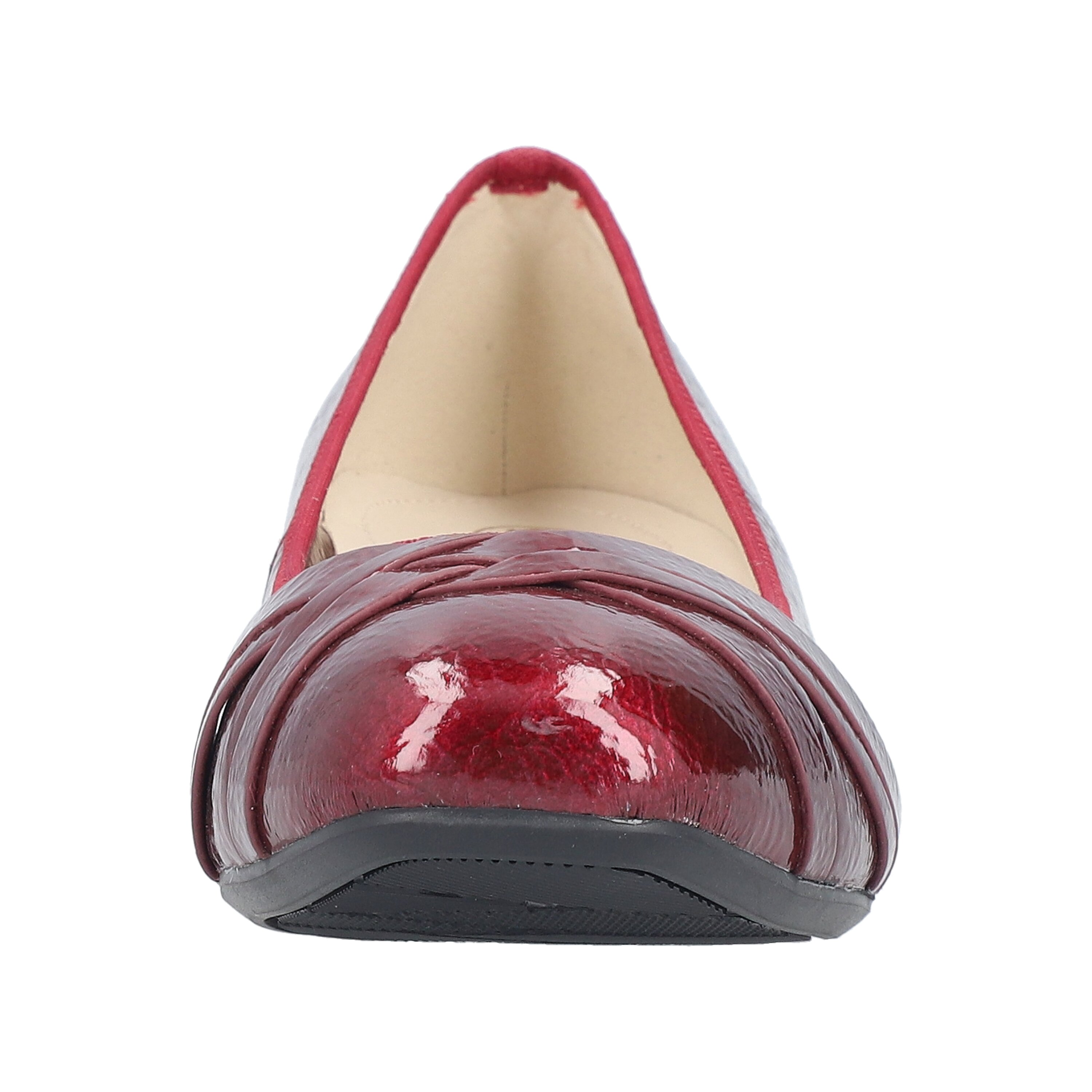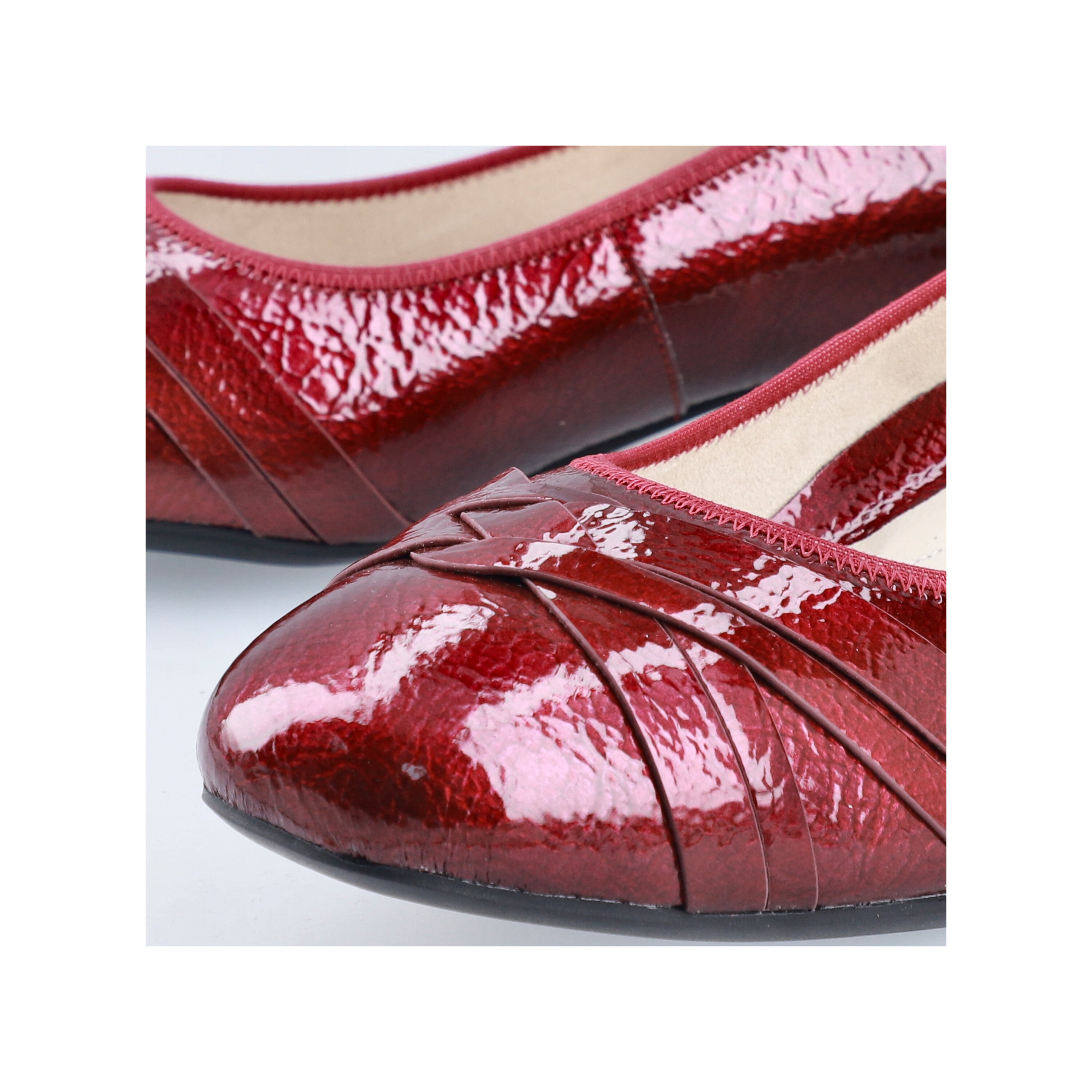 Stylové a zároveň velmi pohodlné lakované lodičky s jemným leskem okouzlí svým ženským designem. Propletené pásečky na špičce dodávají botám originální vzhled, zatímco zakulacená přední část zajišťuje dostatek prostoru pro prsty. Stélka je vyměkčená. Obuv je v šíři G. Podešev je syntetická, flexibilní. Výška podpatku je 3,5 cm. Barva u tohoto vzoru je červená.