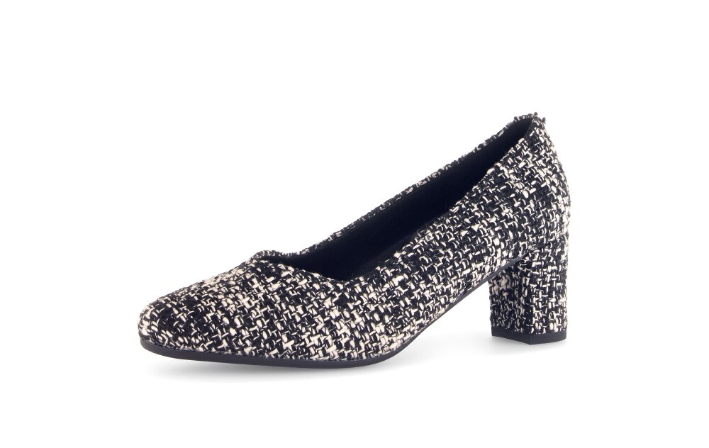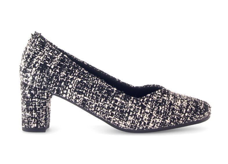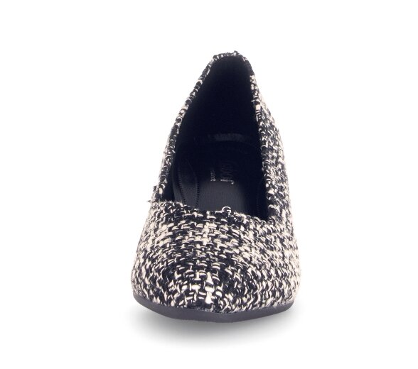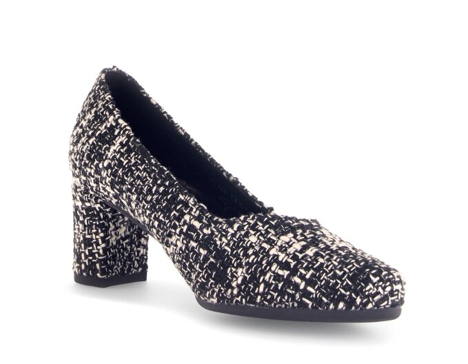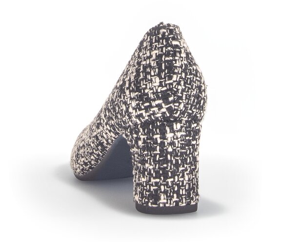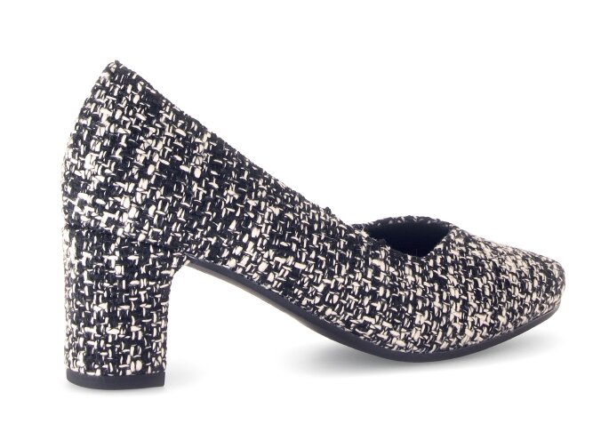 Objevte dokonalou kombinaci pohodlí, stylu a sofistikovaného vzhledu s těmito dámskými lodičkami v luxusním melírovaném textilním provedení, které připomíná legendární kostýmový materiál á la Chanel. Vrchní materiál je textil. Vnitřní materiál lodiček je kůže v kombinaci se syntetikou. Stélka je vyměkčená, kožená. Obuv je v šíři G. Podešev je syntetická, flexibilní. Výška podpatku je 6 cm. Barva u tohoto vzoru je černo - bílá.