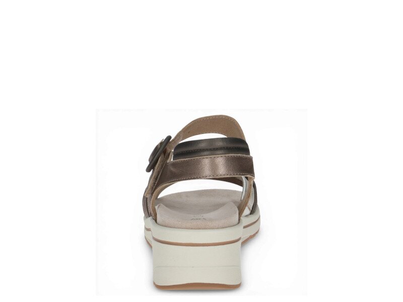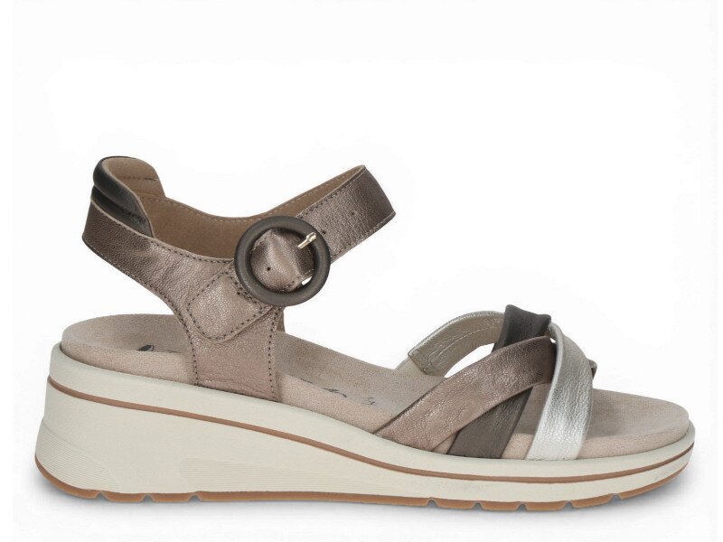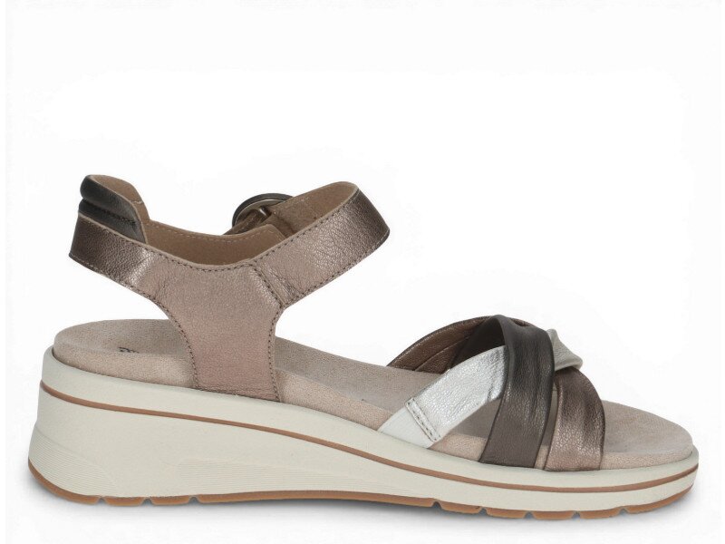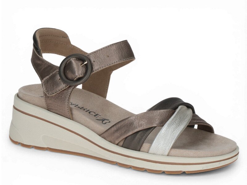 Dámské sandály na mírném klínku vás okouzlí svým provedením, stejně jako barevnou kombinací odstínů hnědé a stříbrné s metalickým nádechem. Vhodné pro každý den stejně jako na společenské akce.