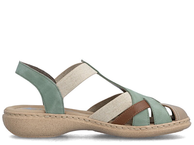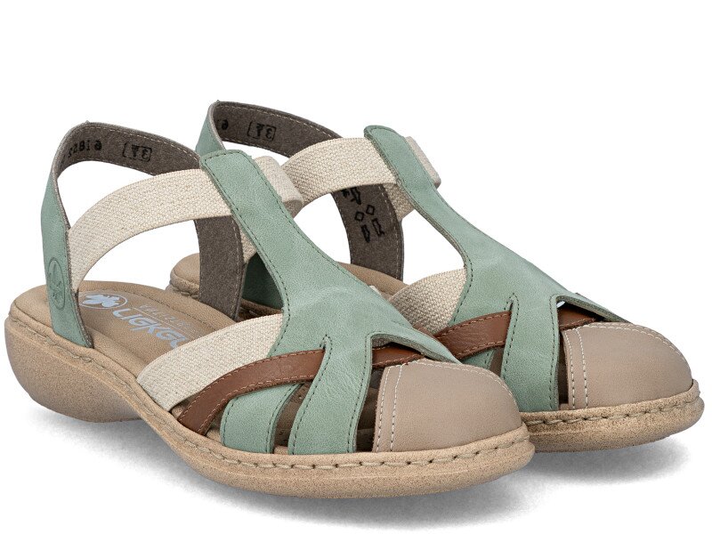Vícebarevné sandále na mírně vyvýšeném podpatku s gumičkami, které dopřejí pohodlné nazouvání i komfort při celodenním nošení. Obuv je vyvedena z eko kůže, v šíři G. Podešev je syntetická, výška podešve je 3,3 cm.