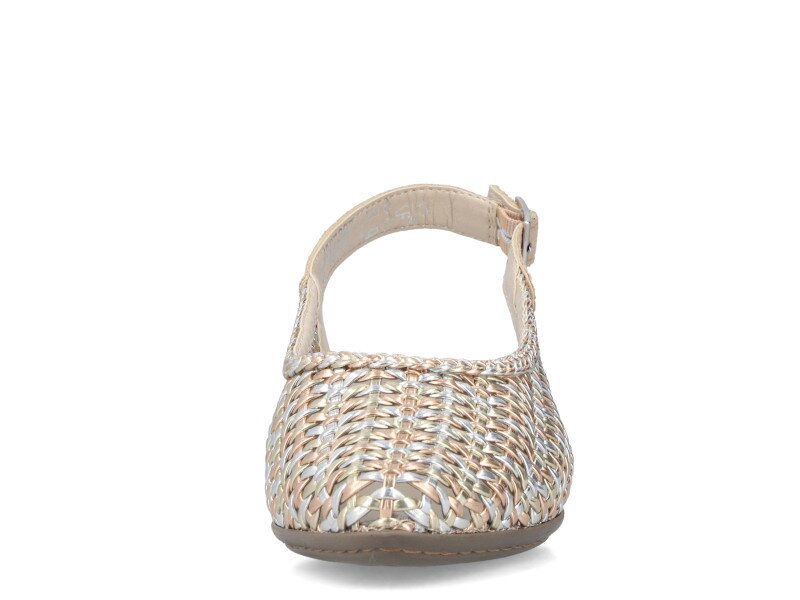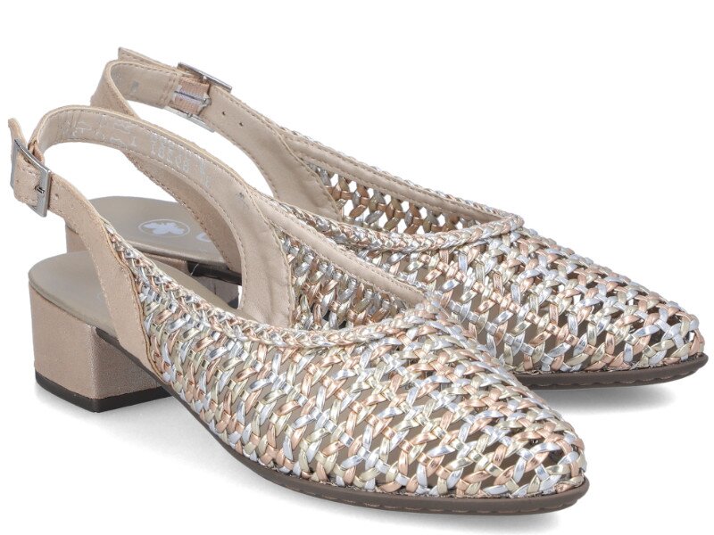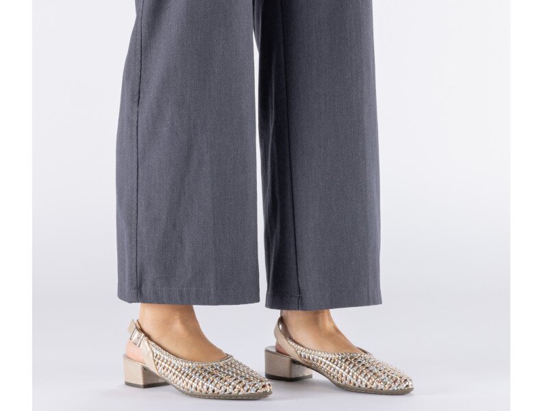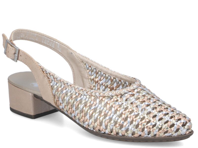 Dámské lodičky v metalické barvě s odlesky zlaté a stříbrné, s otevřenou patou a zapínáním na přezku. Vrchní materiál, stélka i podešev jsou syntetické. Výška podpatku je 3,5 cm. Šíře obuvi je G.