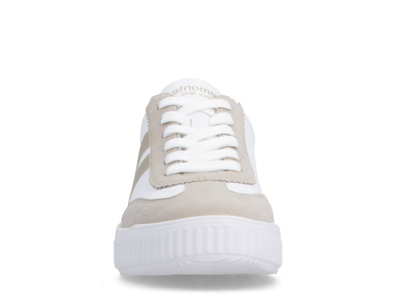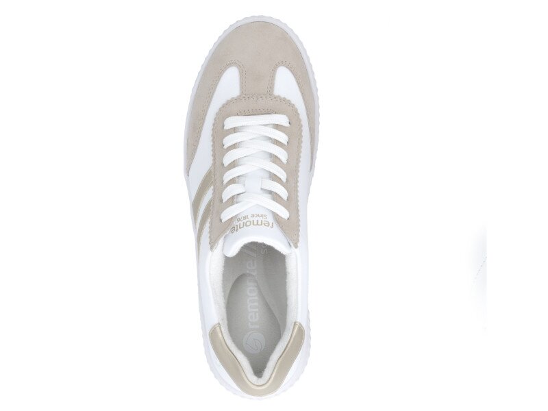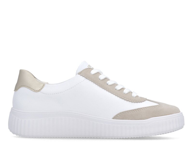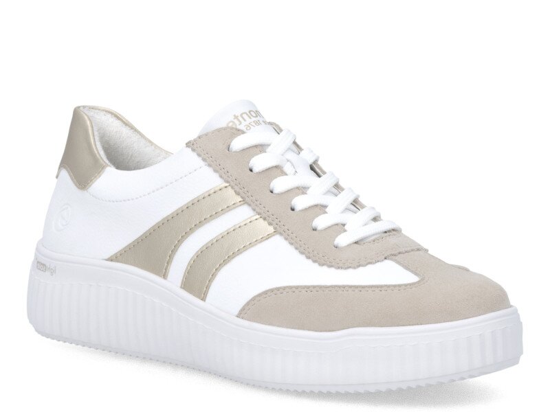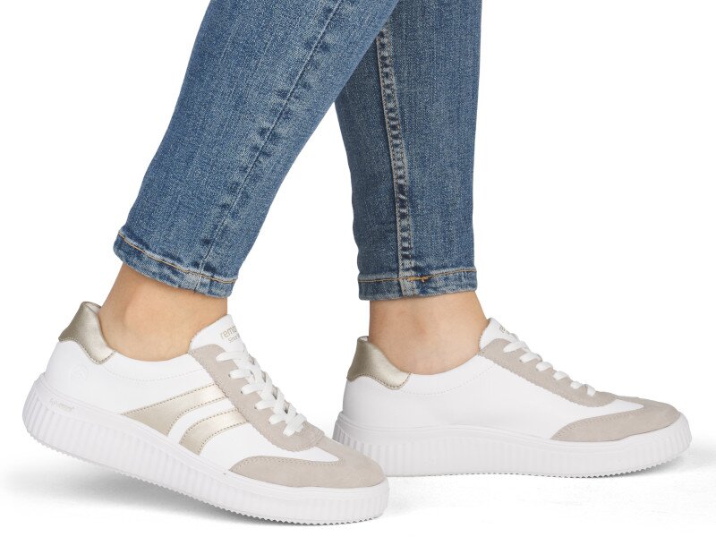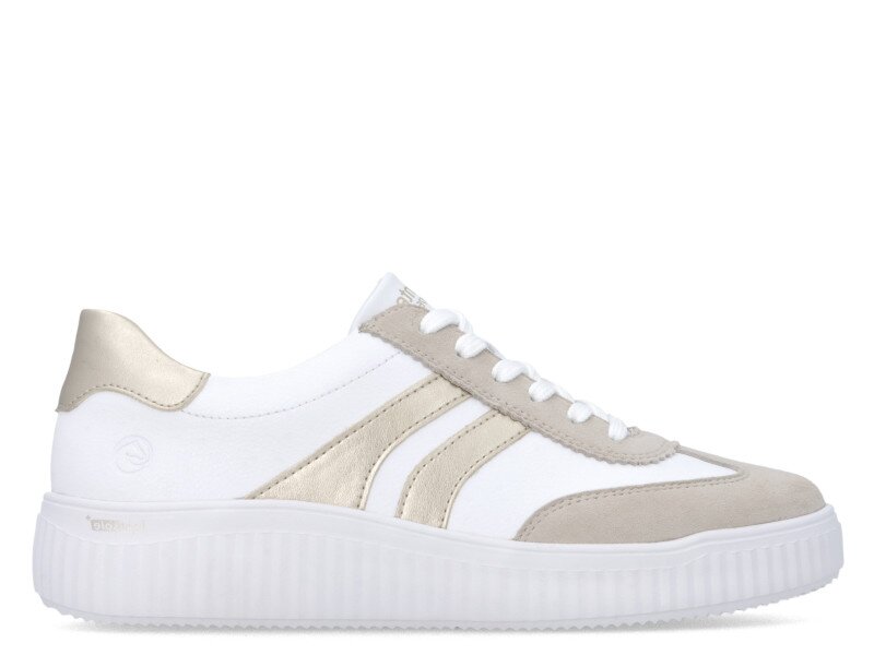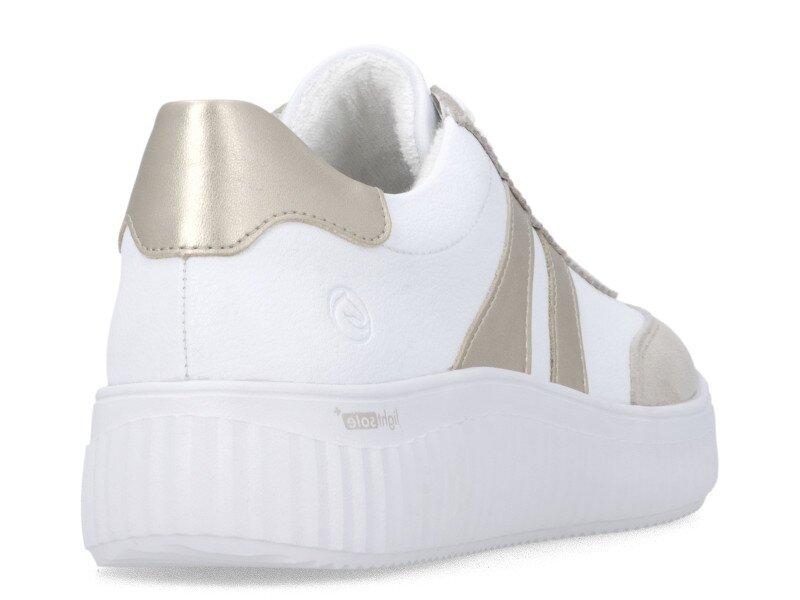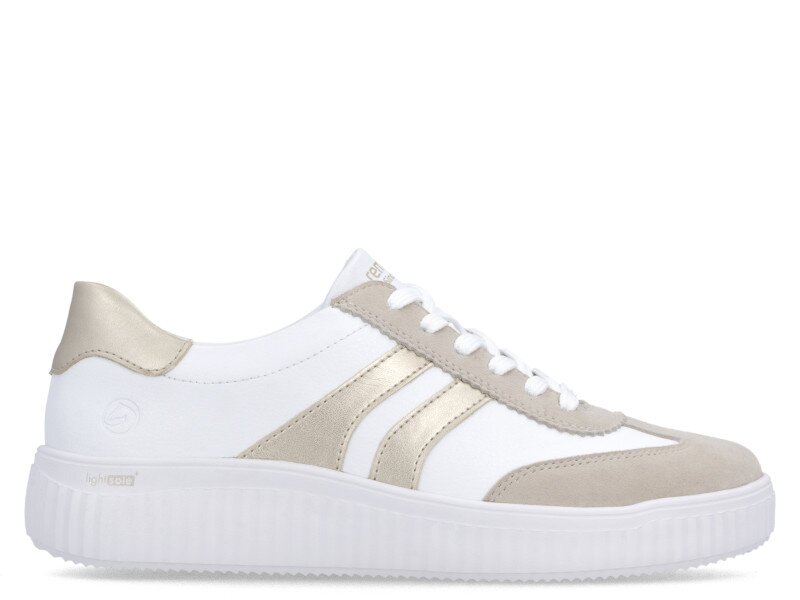 Pohodlné dámské tenisky v bílé barvě s béžovými a zlatými detaily zaručující celodenní pohodlí díky stélce z paměťové pěny, kterou je možné vyjmout a vyměnit například za vlastní ortopedickou vložku. Špička boty poskytuje dostatek místo pro prsty. Vrchní materiál je kůže, stélka je textilní a podešev syntetická. Výška podpatku je 4,3 cm. Obuv je v běžné šíři H - vhodné i pro halluxy.