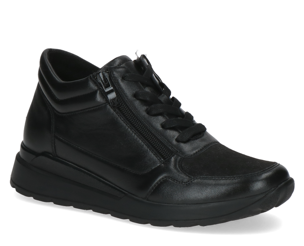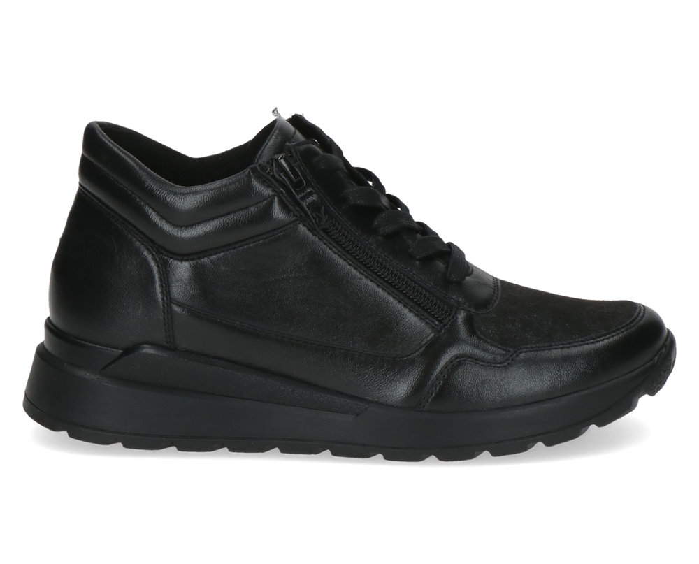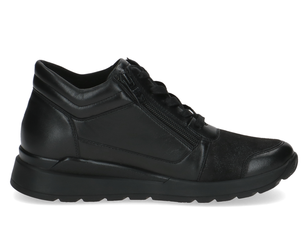 Vyšší tenisky sneaker v komfortním provedení vás provedenou zimním i podzimním nečasem v pohodlí a v suchu. Vrchní materiál je hladká kůže. Vnitřní materiál je kombinace kůže a syntetiky. Stélka je vyměkčená, vyjímatelná s memotion stélkou. Obuv má technologii Stretch out - pruzná a ohebný materiál ve špici pro komfortní nošení irpo široké chodidlo. Obuv je v šíři H. Podešev je syntetická, flexibilní. Výška podpatku je 4,4 cm. Barva u tohoto vzoru je černá.