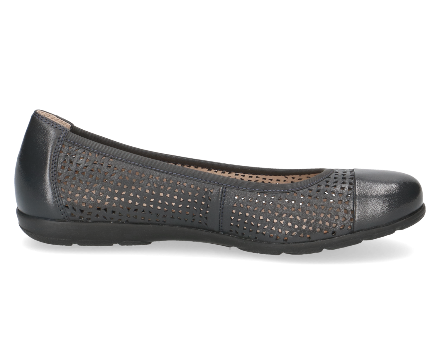 Balerínky v z perforované kůže. Vrchní materiál je hladká, perforovaná kůže. Vnitřek obuvi je kombinace syntetiky a kůže, včetně nášlapné stélky která je vyměkčená, kožená. Barva u tohoto vzoru je modrá. Podešev je syntetická, flexibilní. Výška podpatku je cca 2 cm.