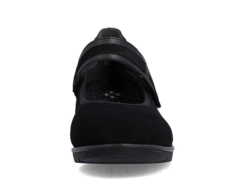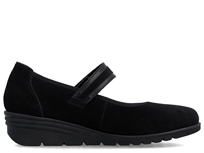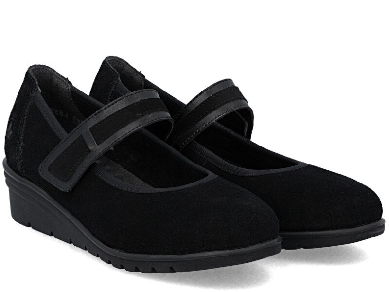 Černé baleríny na nízkém pohodlném klínku s páskem přes nárt na suchý zip.