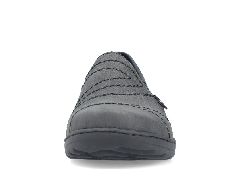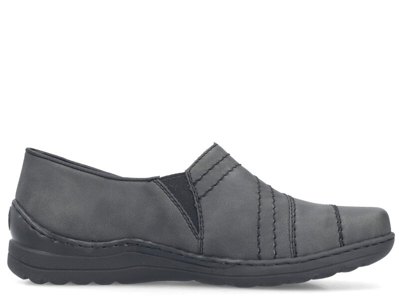 Dámské mokasíny v šedé barvě. Vrchní materiál je syntetiky, vnitřní materiál je kombinace textilu a syntetiky. Obuv je v šíři G. Podešev je syntetická, flexbilní. Výška podešve je 2,9 cm.