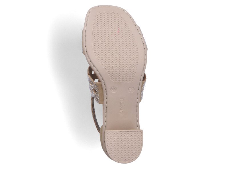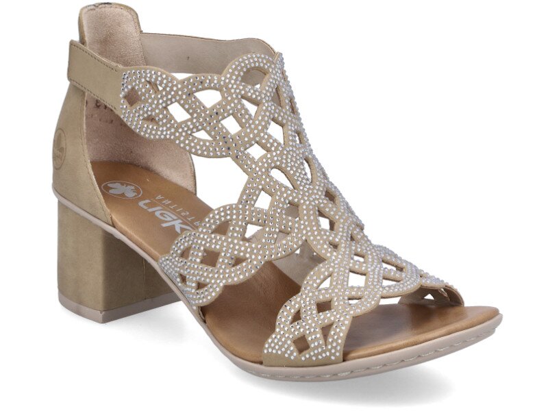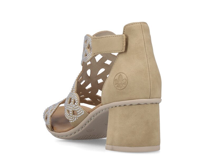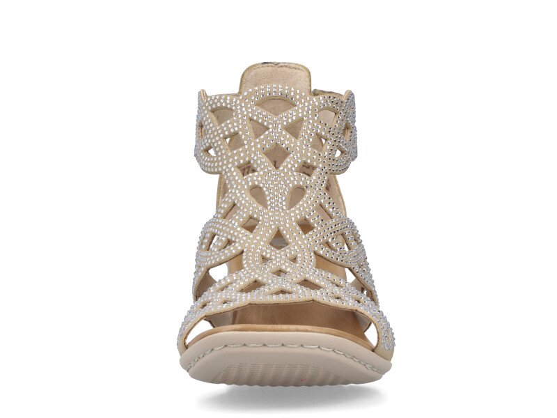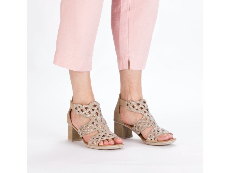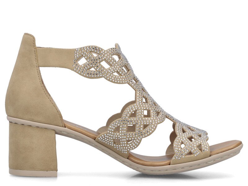 Dámské sandály v béžové barvě na suchý zip a s kamínky. Vrchní materiál je syntetiký, stélka je textilní a podešev je syntetická. Výška podpatku je cca 5,6 cm. Šíře obuvi je G.