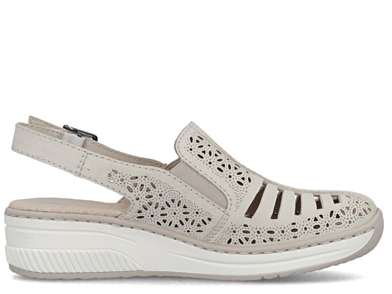 Dámské sandály v béžové barvě s otevřenou patou a zapínáním na přezku. Vrchní materiál je měkká kůže, stélka je kombinace kůže a syntetiky. Podešev je syntetická. Výška podpatku je 4,3 cm. Šíře obuvi je F.
