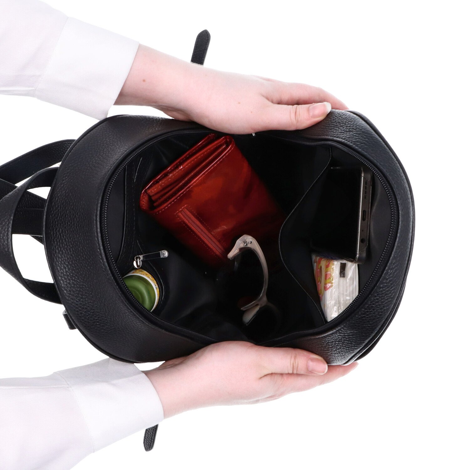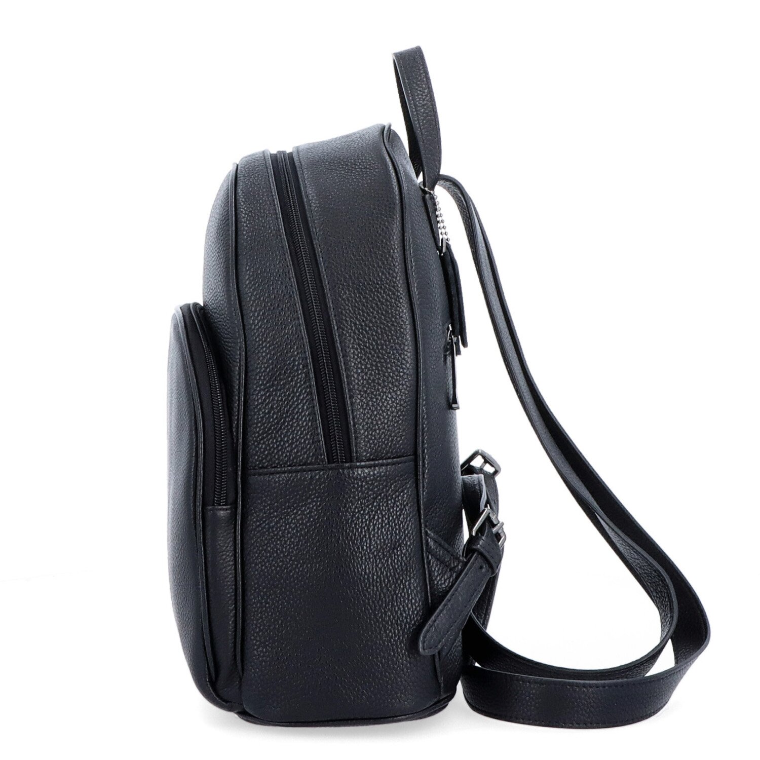 Černý batoh má hlavní kapsu na zip, ta obsahuje zipovou kapsu a kapsu bez zipu. Další kapsa na zip je na zádech i na přední straně batohu. Objem batohu jsou 12 l. Vnější materiál je pravá kůže a podšívka je textilní. Maximální délka popruhů je 90 cm. Rozměry batohu jsou 26 x 31 x 13 cm. Dokument A4 se do batohu nevejde.