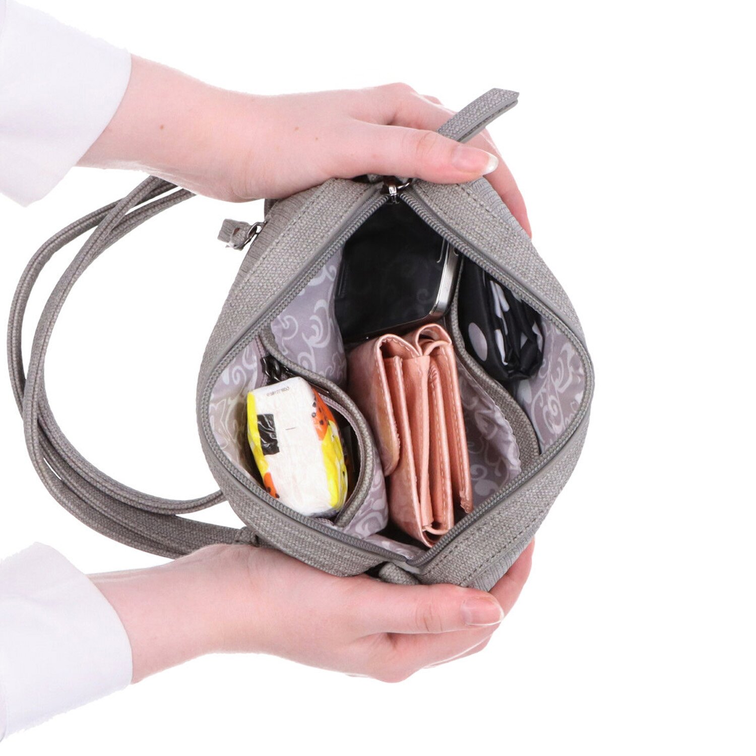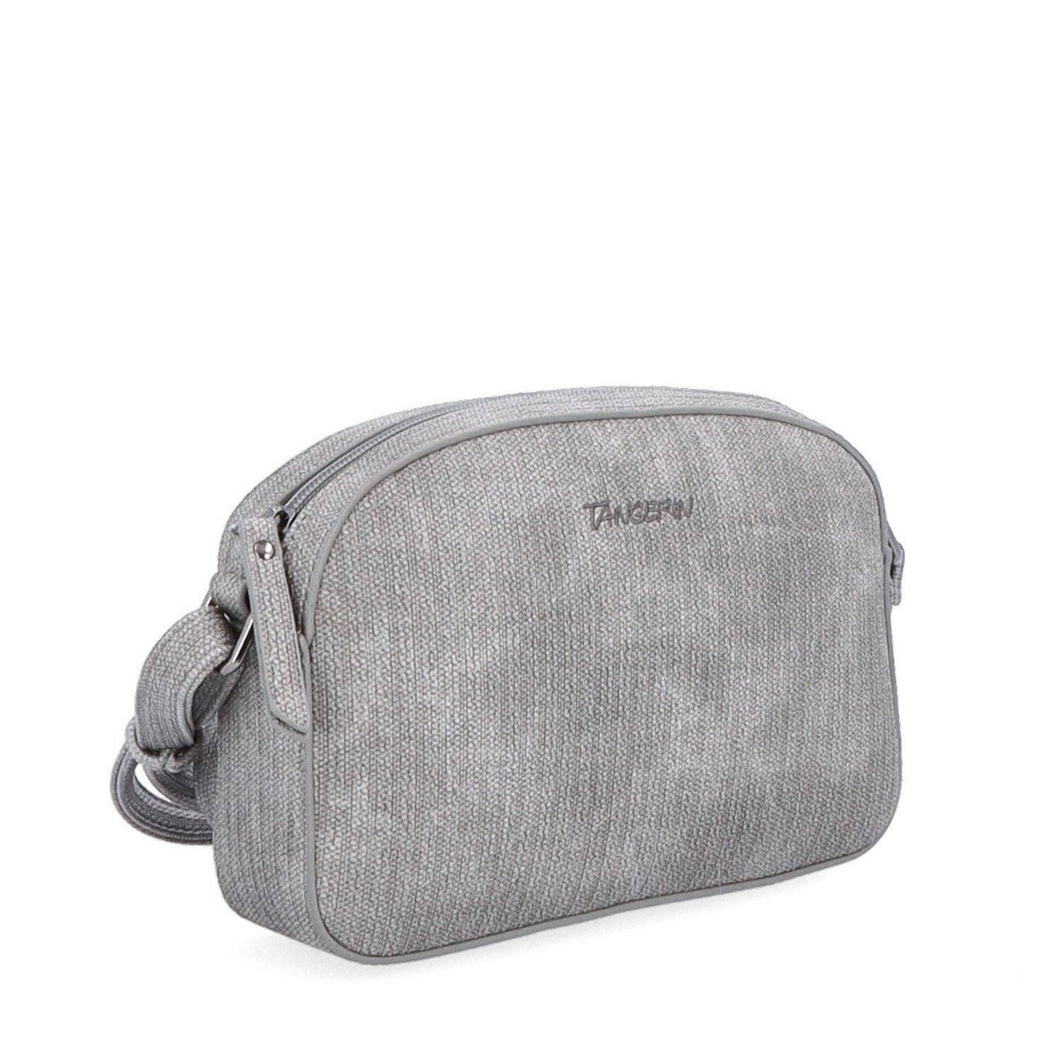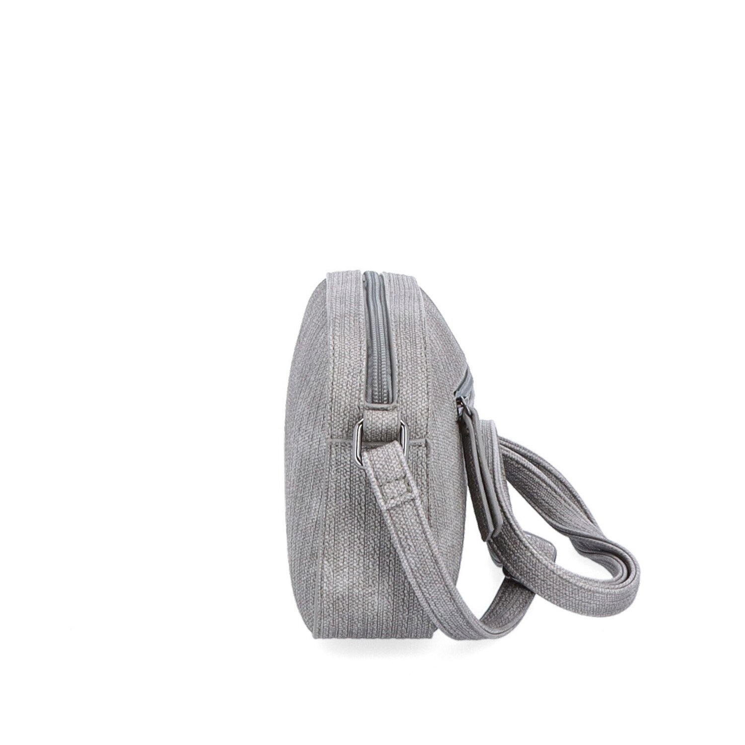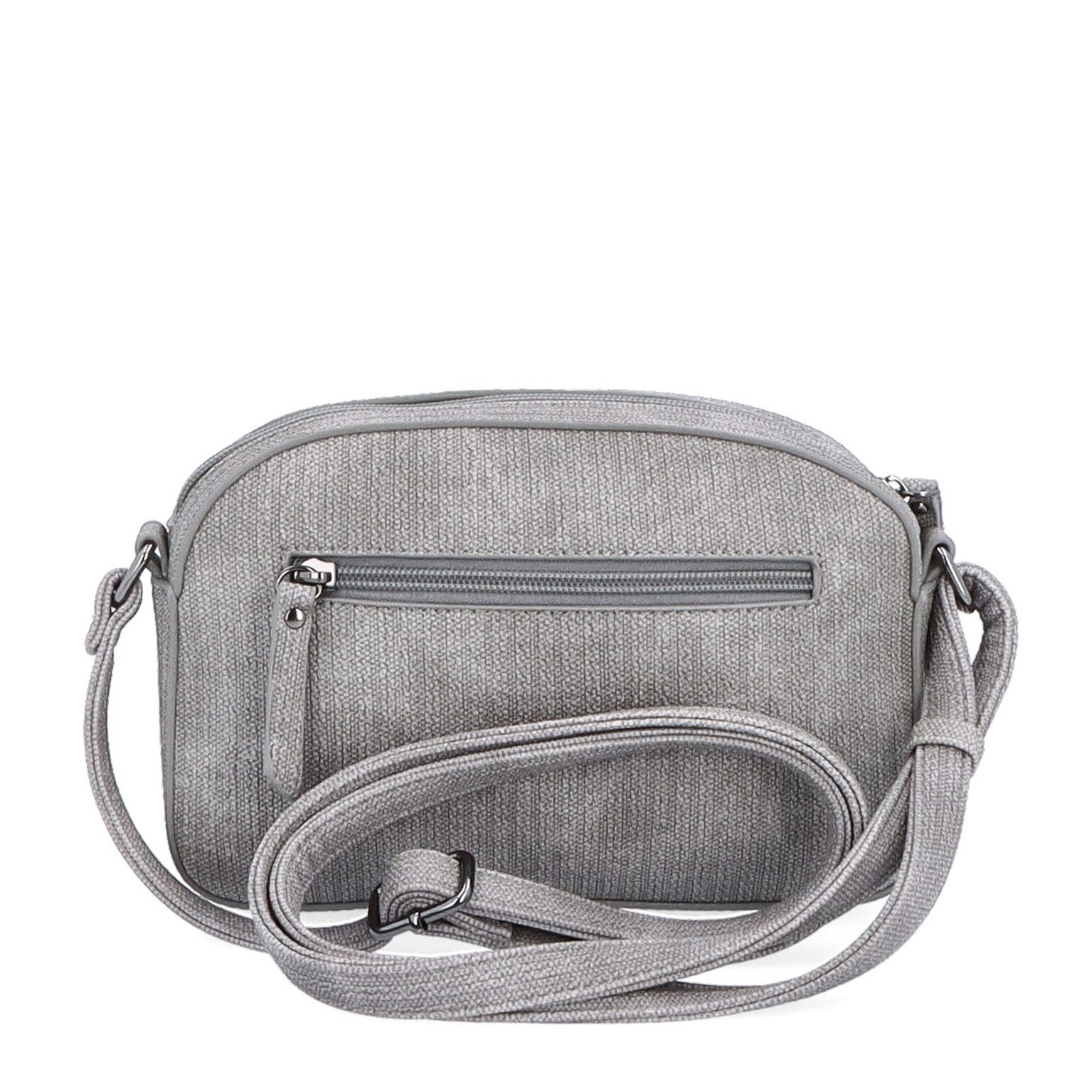 Šedá hladká crossbody kabelka má hlavní kapsu na zip. Uvnitř ní je další kapsa na zip a kapsa bez zipu. I na zadní straně vně kabelky je také kapsa na zip. Má dlouhý nastavitelný popruh, který nelze odepnout a jeho maximální délka je 155 cm. Materiál je syntetická kůže a textilní podšívka. Rozměry kabelky jsou 22 x 15 x 5 cm. Dokument A4 se do kabelky nevejde.