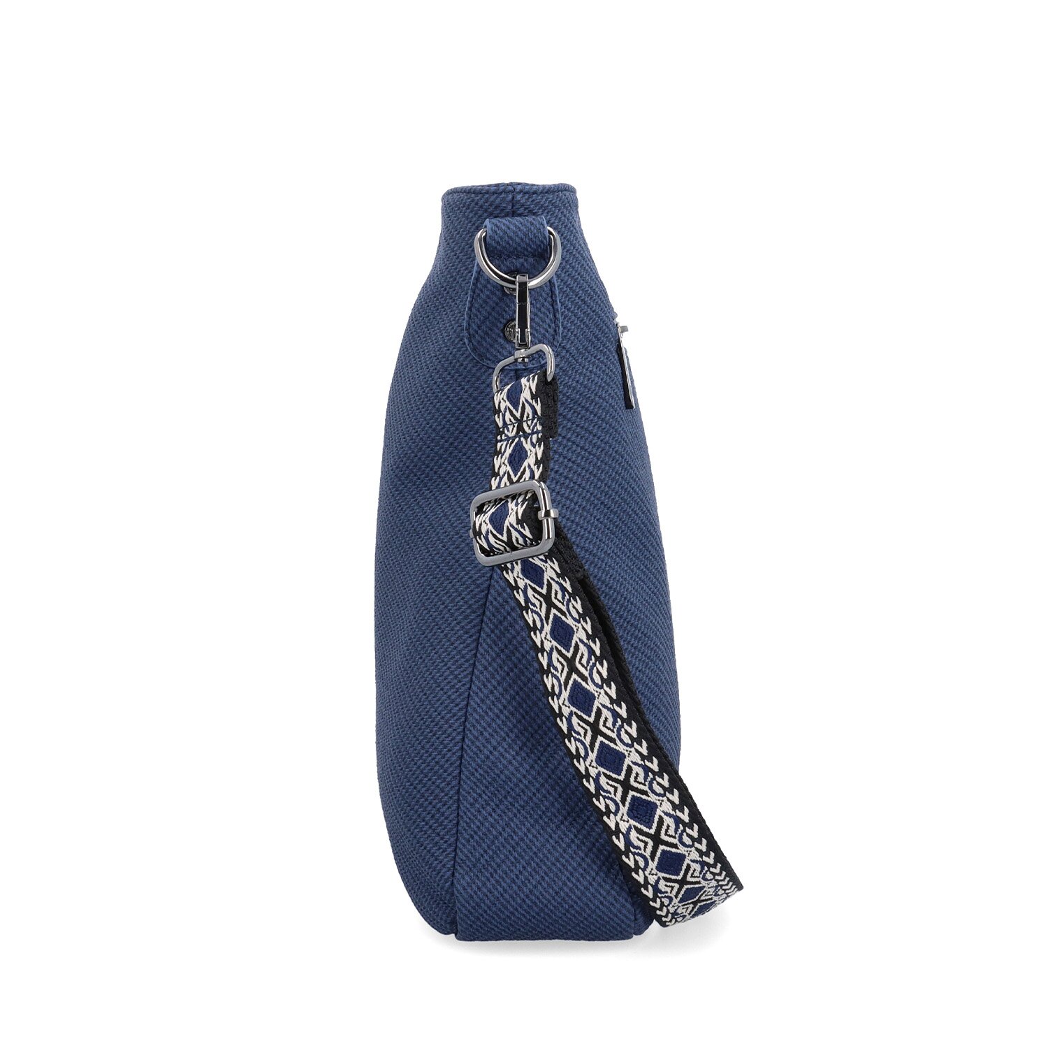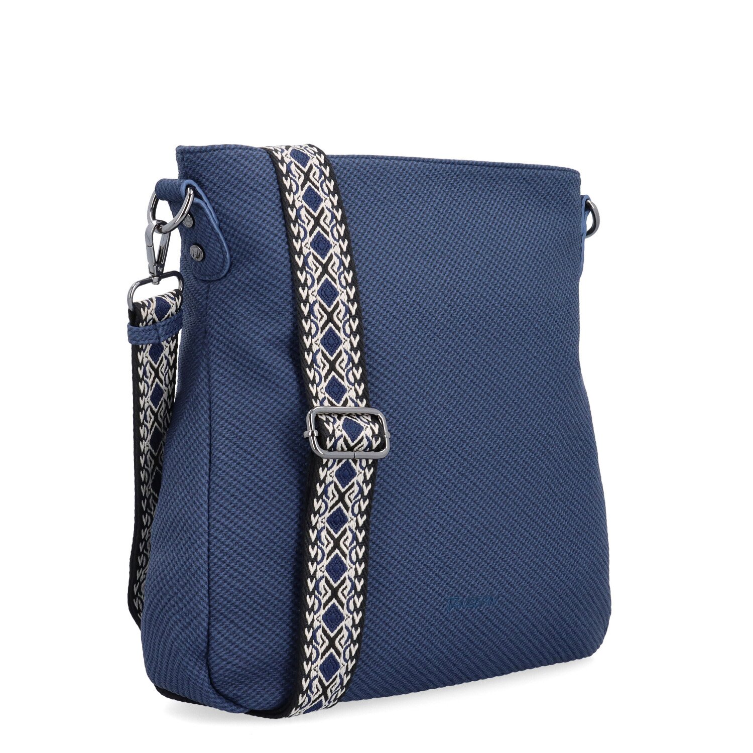 Modrá crossbody kabelka má hlavní kapsu na zip. Uvnitř ní je další kapsa na zip a 2 kapsy bez zipu. I na zadní straně vně kabelky je kapsa na zip. Má dlouhý nastavitelný popruh, který lze odepnout a jeho maximální délka je 160 cm. Materiál je syntetická kůže a textilní podšívka. Rozměry kabelky jsou 30 x 32 x 8 cm. Dokument A4 se do kabelky vejde.