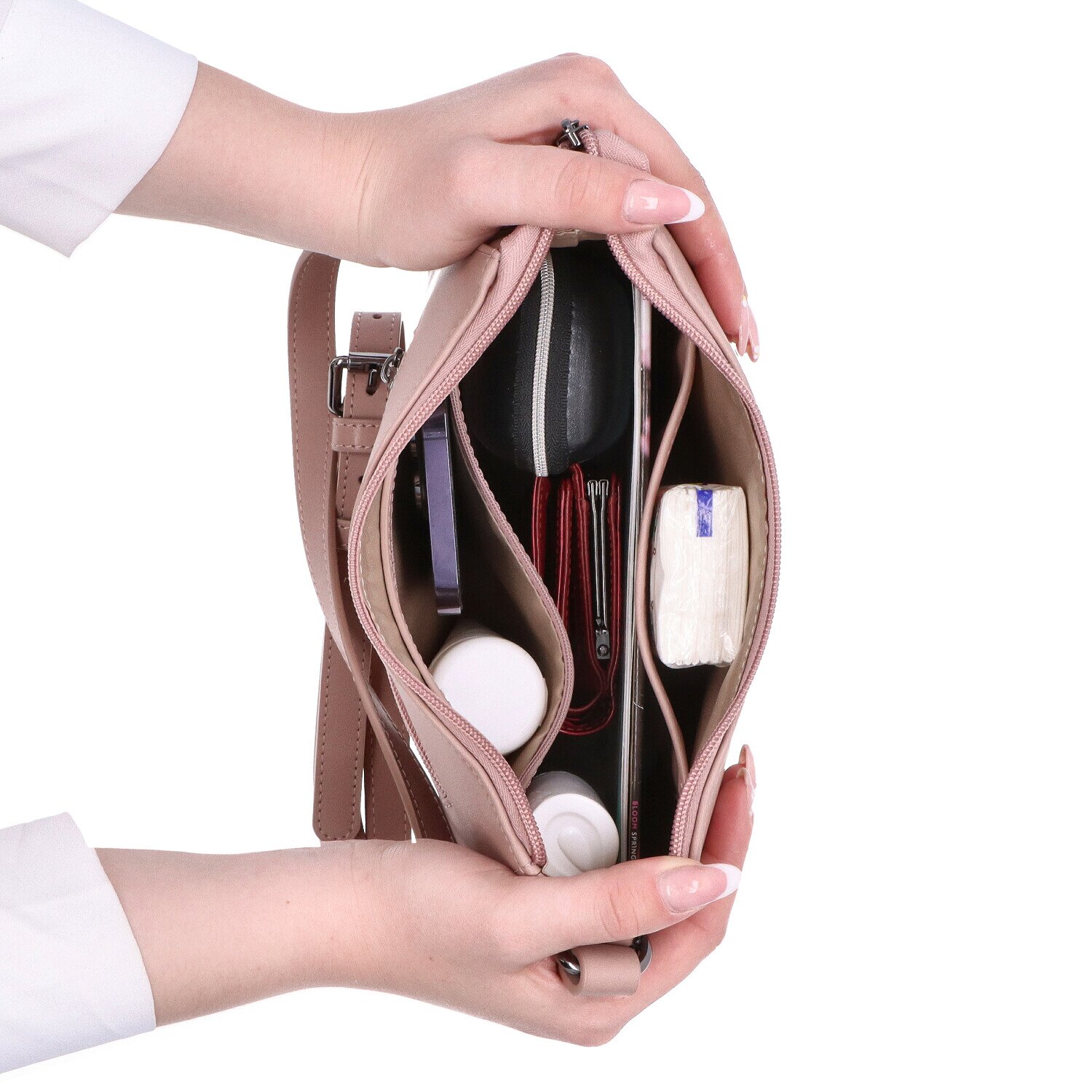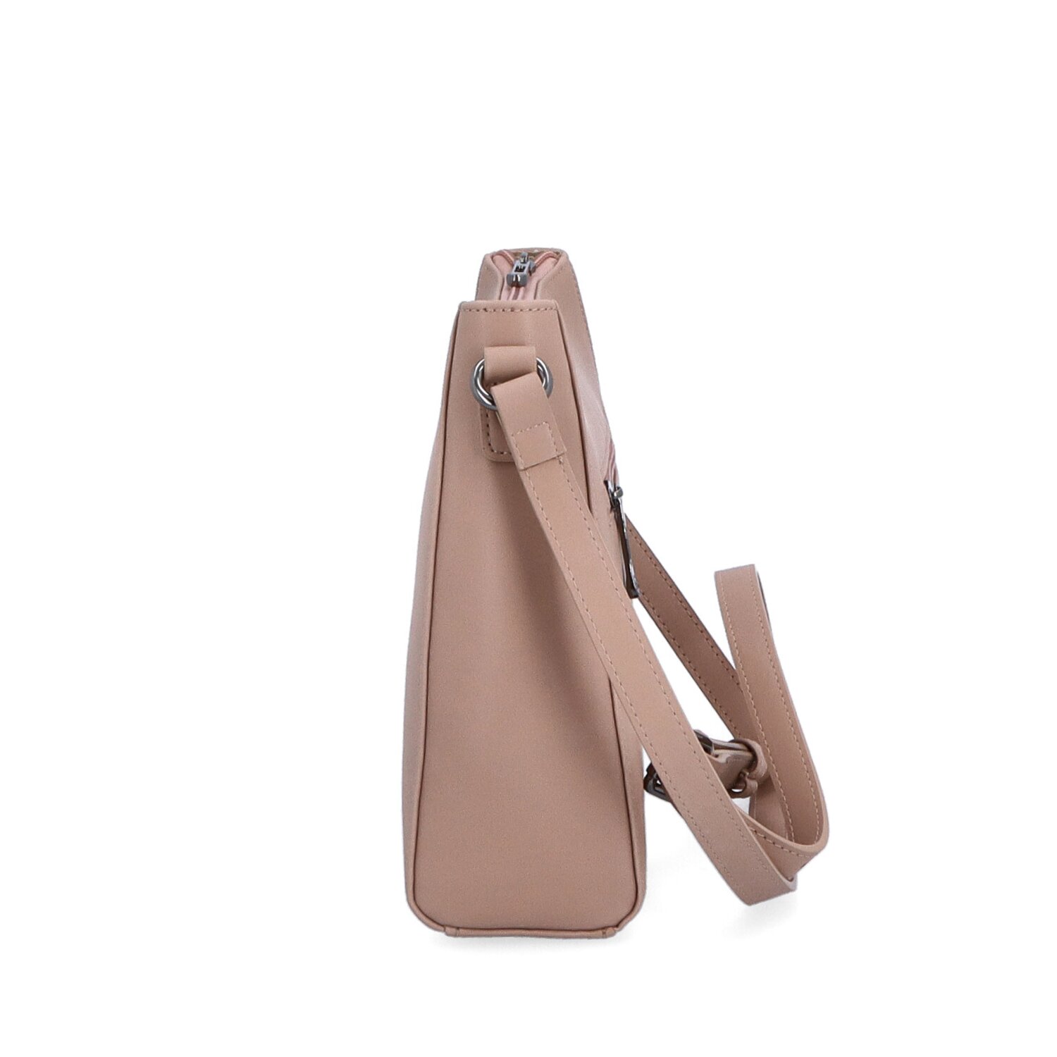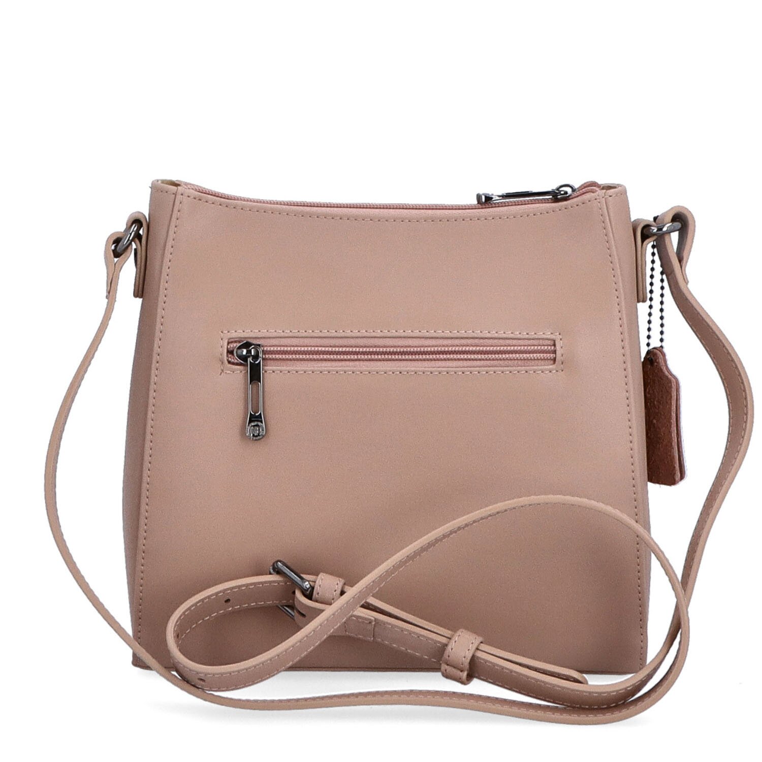 Hladká kožená tělová kabelka s textilní podšívkou. Kabelka má jeden klasický kožený popruh, jehož maximální délka je 140 cm. Kabelka má hlavní kapsu na zip, uvnitř menší kapsu na umístění drobností jako je rtěnka nebo klíče bez zipu a jednu další kapsu na zip. V zadní části kabelky je také kapsa na zip. Rozměry kabelky jsou 24 x 21 x 7 cm. Dokumenty velikosti A4 se do kabelky nevejdou.