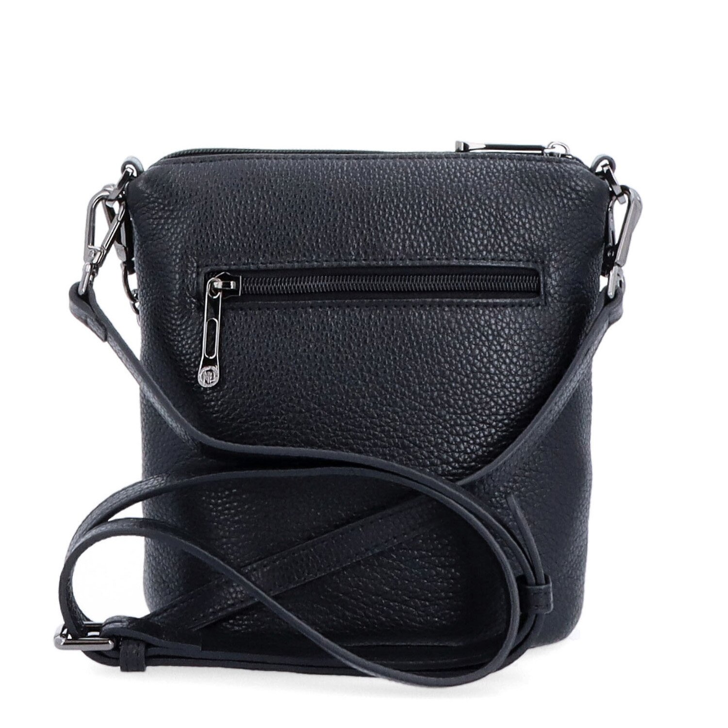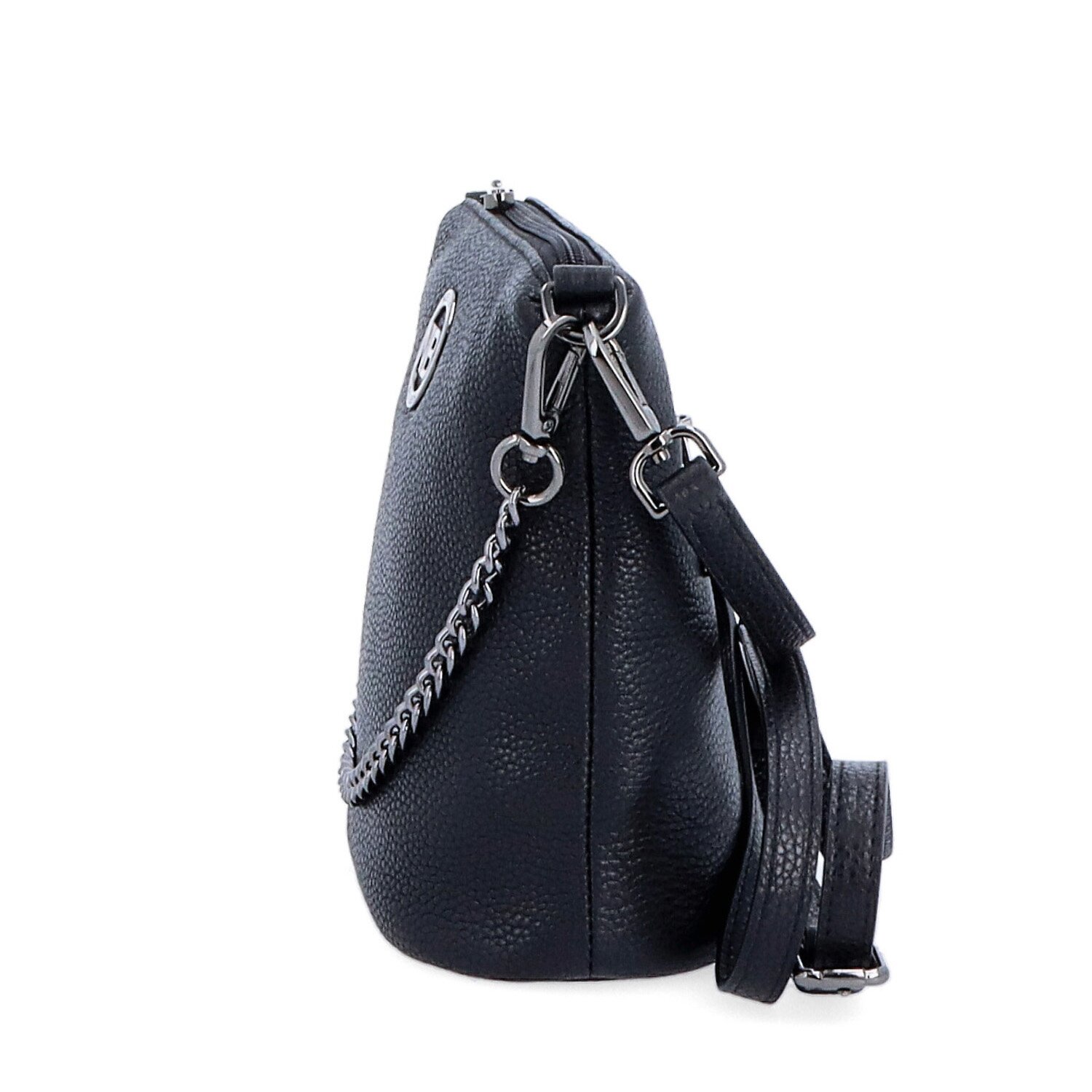 Elegantní kabelka v černé barvě. Má hlavní kapsu se zapínáním na zip, uvnitř je menší kapsa na drobnosti bez zipu a jedna zipová kapsa. V zadní části vně kabelky je také kapsa na zip. Rozměry kabelky jsou 16 x 19 x 10 cm. Oba popruhy jsou odepínatelné. Maximální délka delšího nastavitelného popruhu je 140 cm a délka řetízku je 35 cm. Materiál kabelky je kůže a vnitřní materiál je textil. Dokument A4 se do kabelky nevejde.