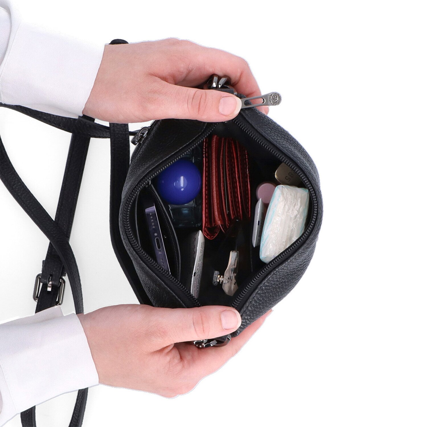 Menší kožená crossbody kabelka se zdobným řetízkem kombinuje praktičnost s elegancí. Poskytuje dostatek prostoru na nezbytnosti a hodí se jak na běžné nošení, tak i na společenské události.