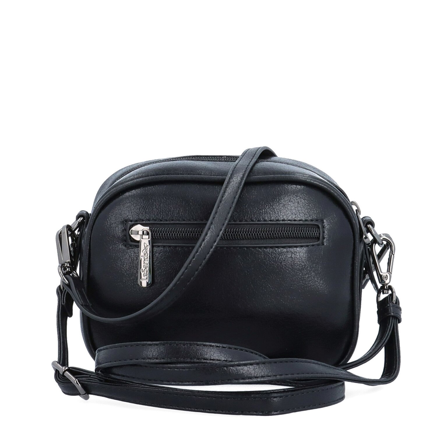Černá crossbody kabelka má hlavní kapsu na zip. Uvnitř ní je další kapsa na zip a kapsa bez zipu na drobnosti. I na zadní straně vně kabelky je kapsa na zip. K dispozici je krátký a dlouhý popruh, jehož maximální délka je 160 cm. Oba lze odepnout. Materiál je syntetická kůže a textilní podšívka. Rozměry kabelky jsou 18 x 14 x 8 cm. Dokument A4 se do kabelky nevejde.