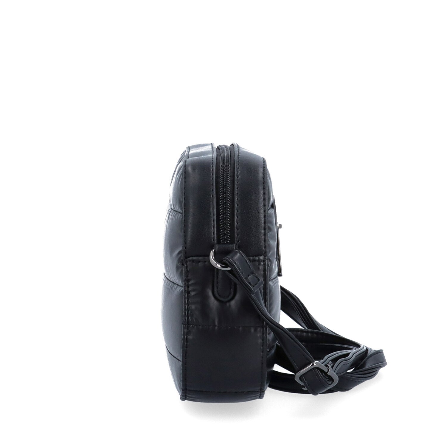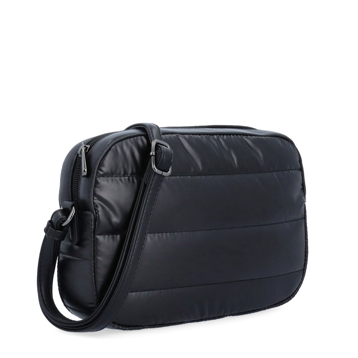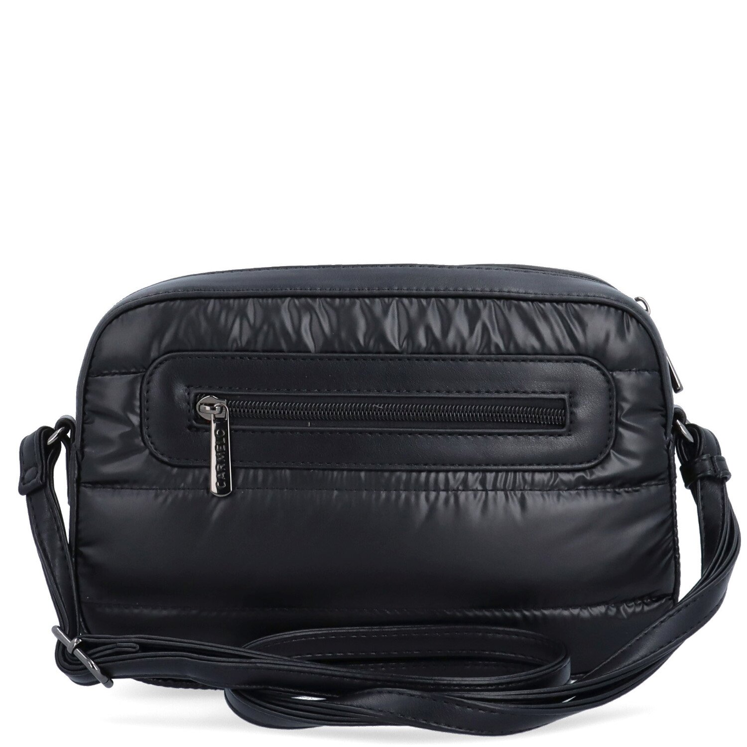 Černá crossbody kabelka má hlavní kapsu na zip. Uvnitř ní je praktická zipová kapsa a kapsa bez zipu na drobnosti. Na zadní straně vně kabelky je také kapsa na zip. Má dlouhý nastavitelný popruh, který nelze odepnout a jeho maximální délka je 150 cm. Materiál je nylonu a textilní podšívka. Rozměry kabelky jsou 24 x 17 x 6 cm. Dokument A4 se do kabelky nevejde.