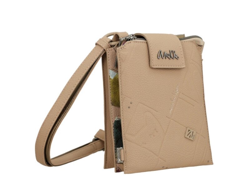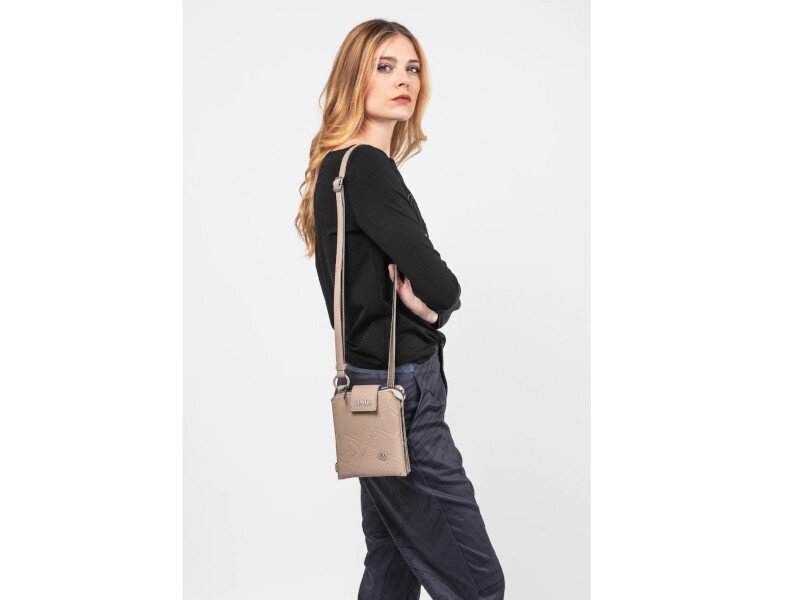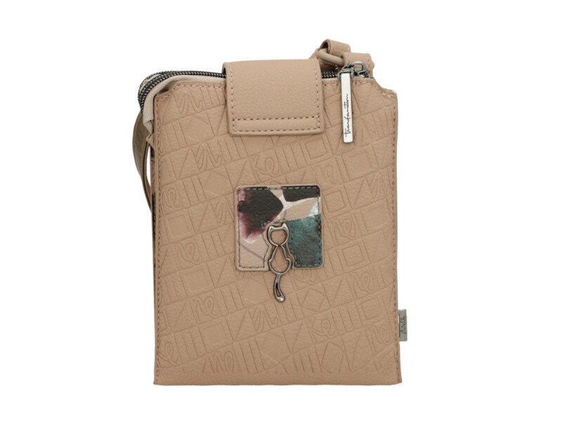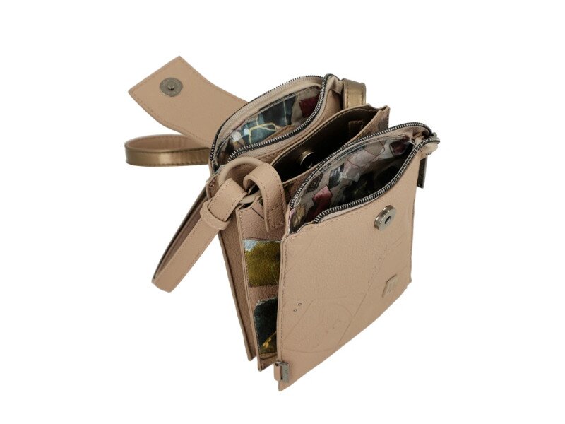 Tato malá kompaktní kabelka v béžové barvě má 3 hlavní kapsy. 2 na zip a jednu na magnetický druk. To celé je chráněné krátkým popruhem. Maximální délka neodepínatelného popruhu je 130 cm. Rozměry kabelky jsou 15 x 18 x 5 cm. Dokumenty A4 se do kabelky nevejdou. Vnější materiál je syntetika a podšívka je textilní.
