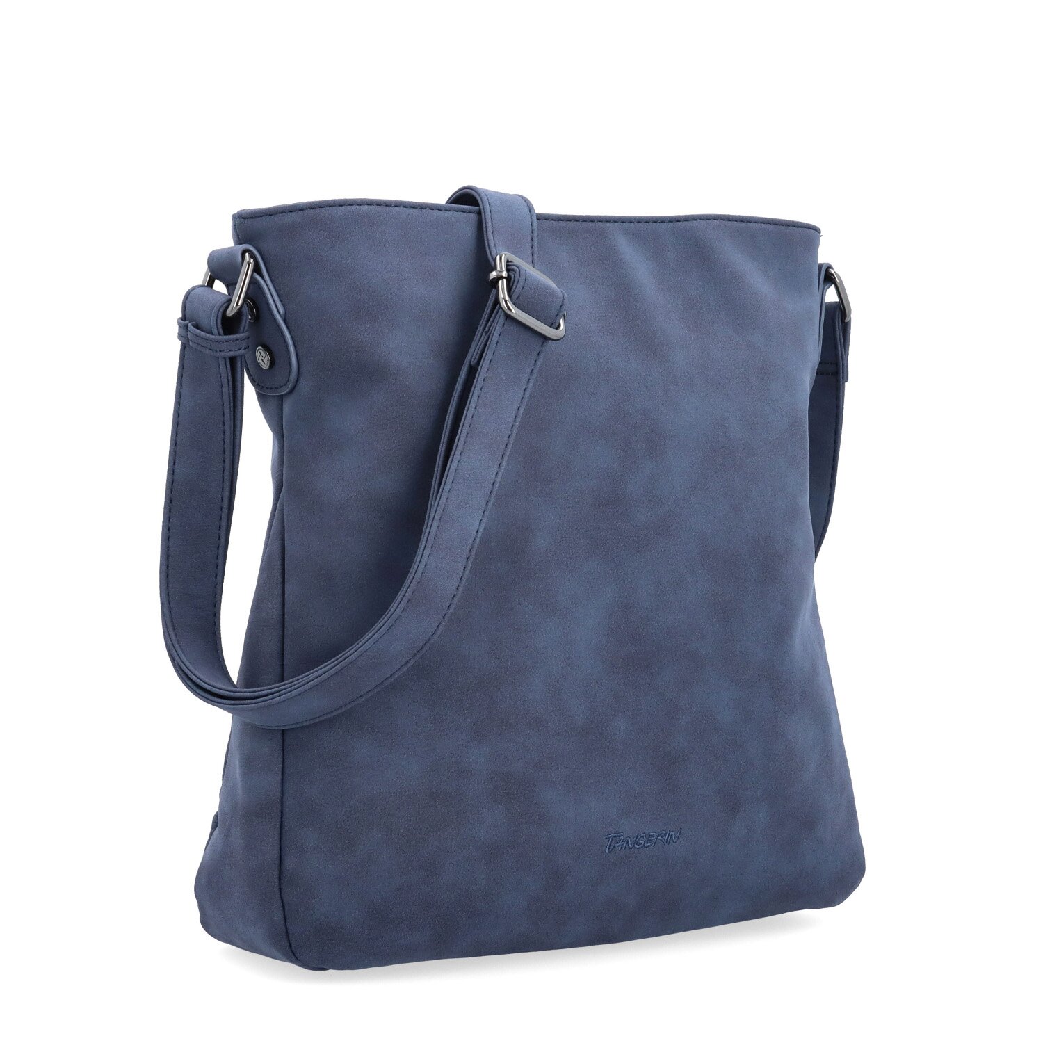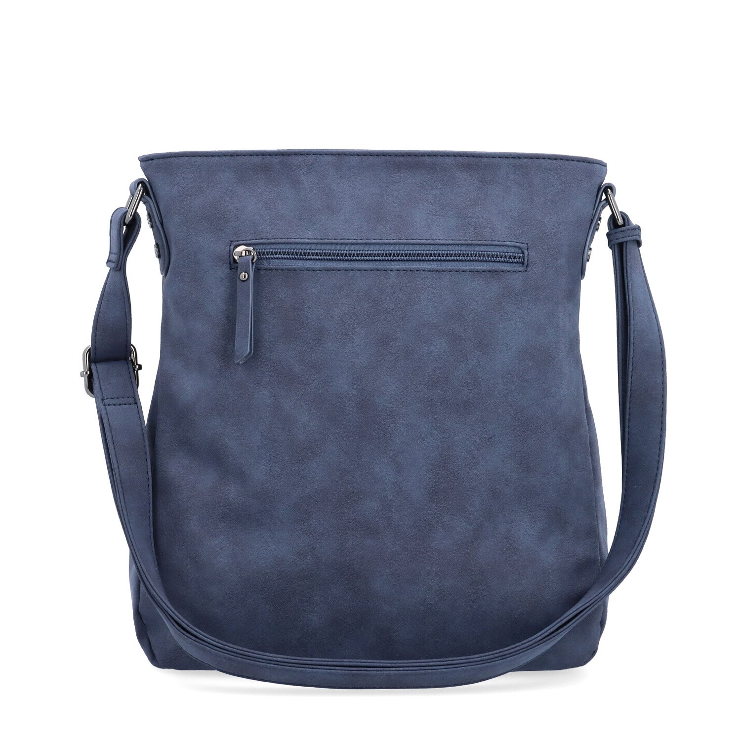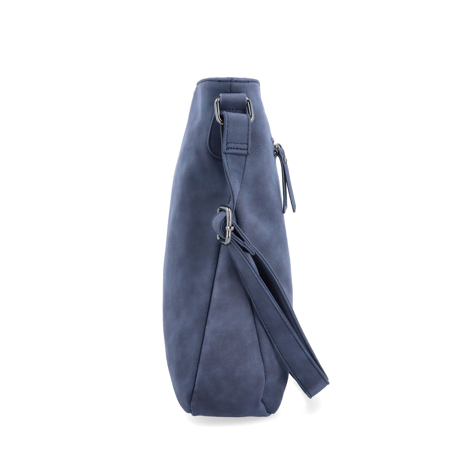 Tmavě modrá hladká crossbody kabelka má hlavní kapsu na zip. Uvnitř ní je další kapsa na zip a 2 kapsy bez zipu. I na zadní straně vně kabelky je kapsa na zip. Má dlouhý nastavitelný popruh, který nelze odepnout a jeho maximální délka je 150 cm. Materiál je syntetická kůže a podšívka je textilní. Rozměry kabelky jsou 30 x 32 x 8 cm. Dokument A4 se do kabelky vejde.