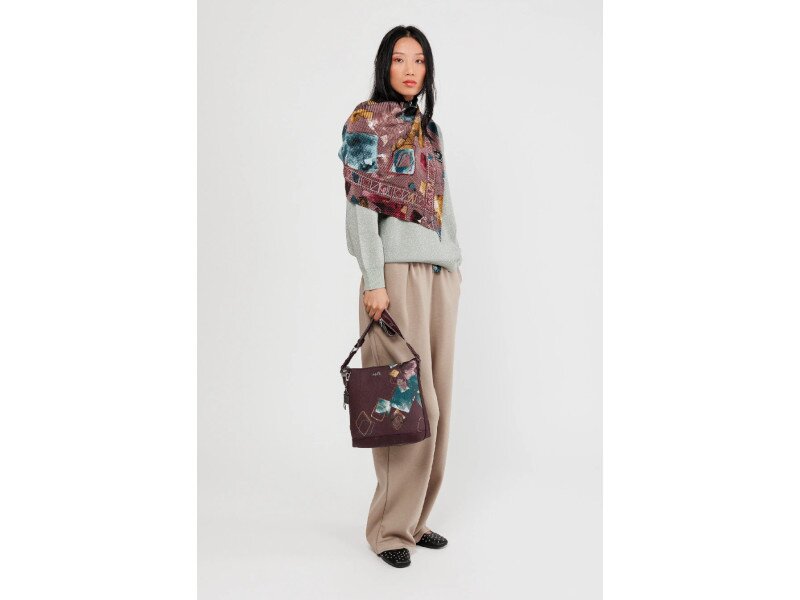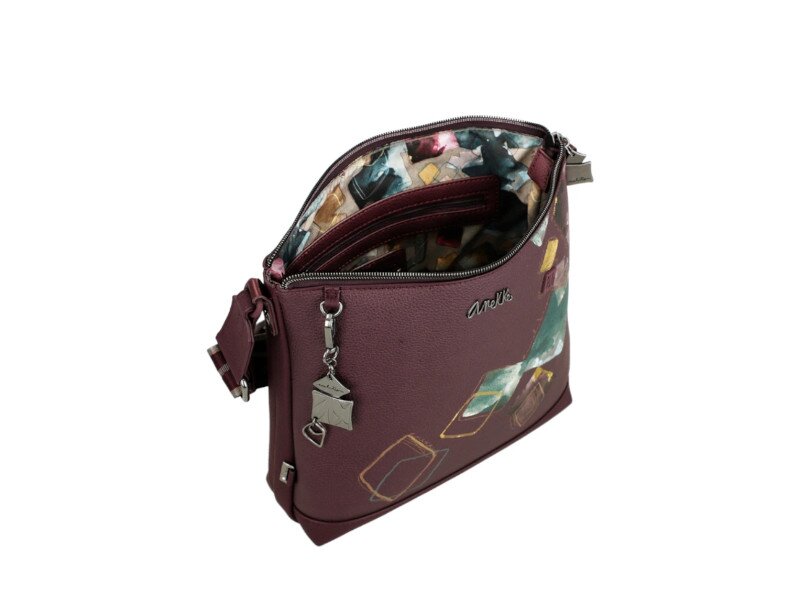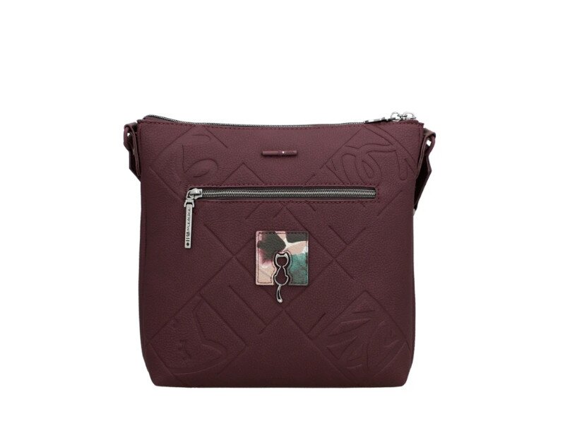 Vínová crossbody kabelka. Hlavní prostor kabelky má zapínání na zip. Uvnitř se nachází zipová kapsa a kapsa bez zipu na drobnosti. Na vnější zadní straně kabelky je další zipová kapsa. Celkový počet kapes je 5. Maximální délka neodepínatelného popruhu je 130 cm. Rozměry kabelky jsou 27 x 25 x 8 cm. Dokumenty A4 se do kabelky nevejdou.