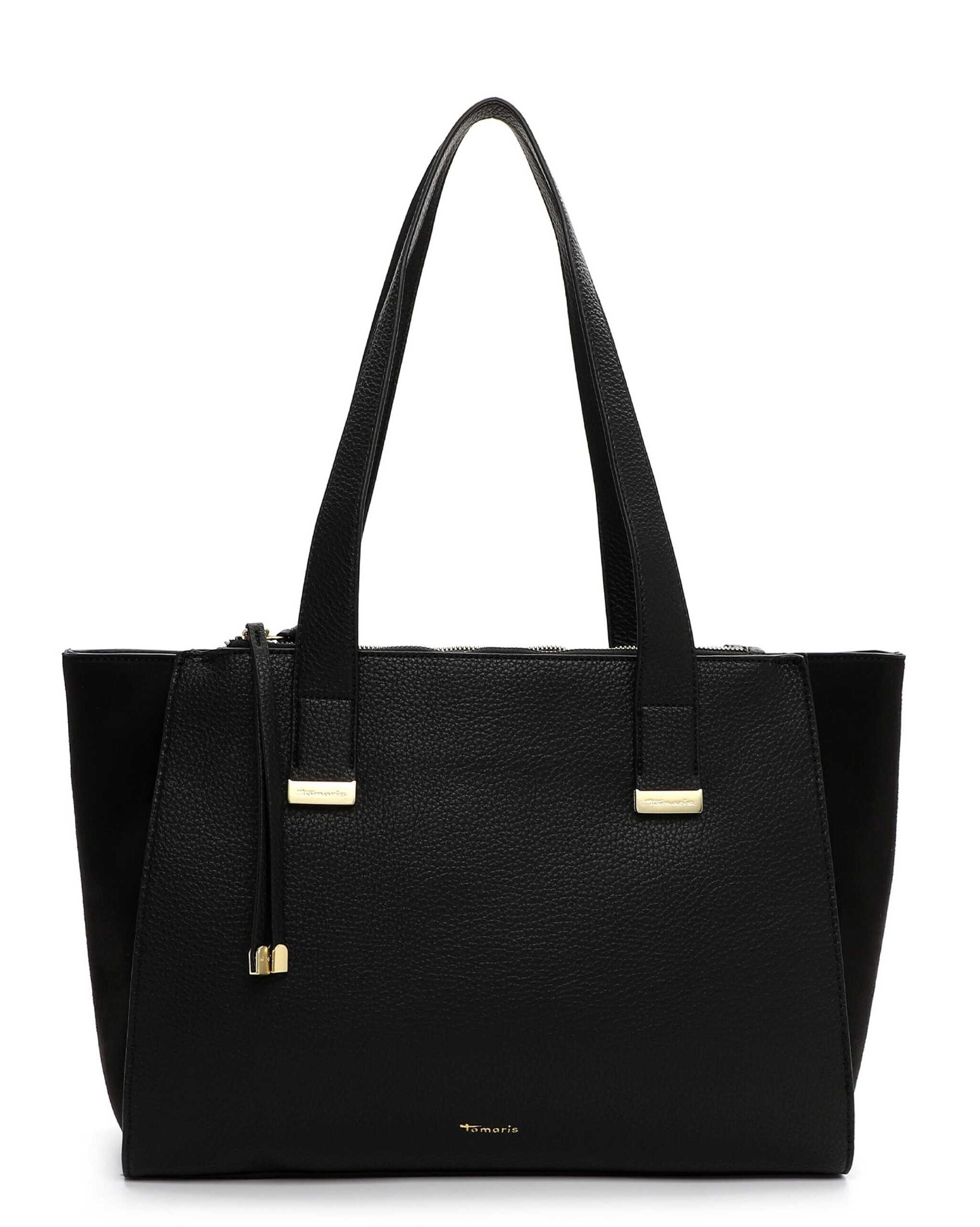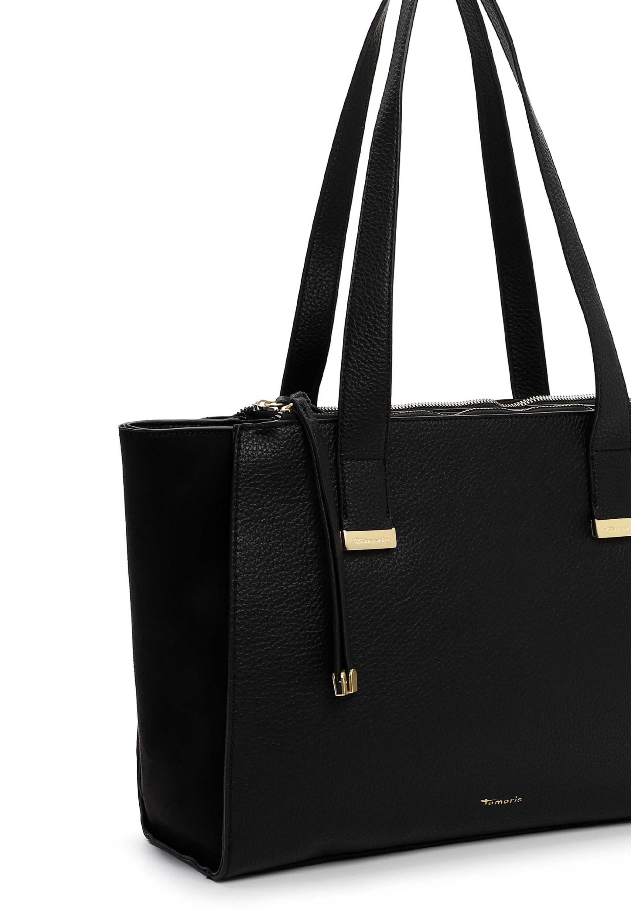 Shopper v elegantní černé barvě se zlatými detaily kombinuje praktičnost s nadčasovým stylem. Prostorný hlavní oddíl a zipová přihrádka na zádech pojmou vše potřebné, zatímco jemné zlaté doplňky dodávají kabelce luxusní nádech.