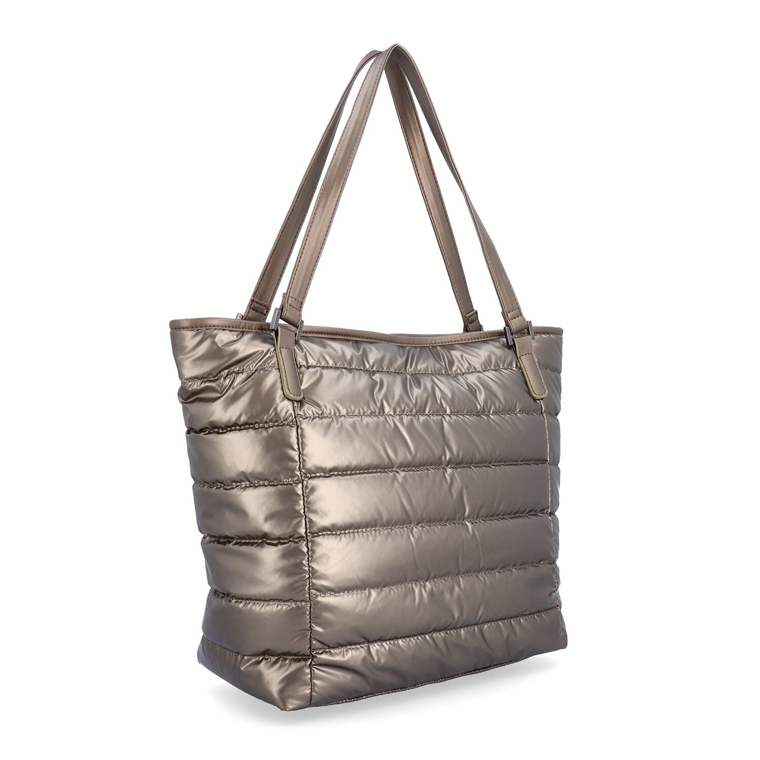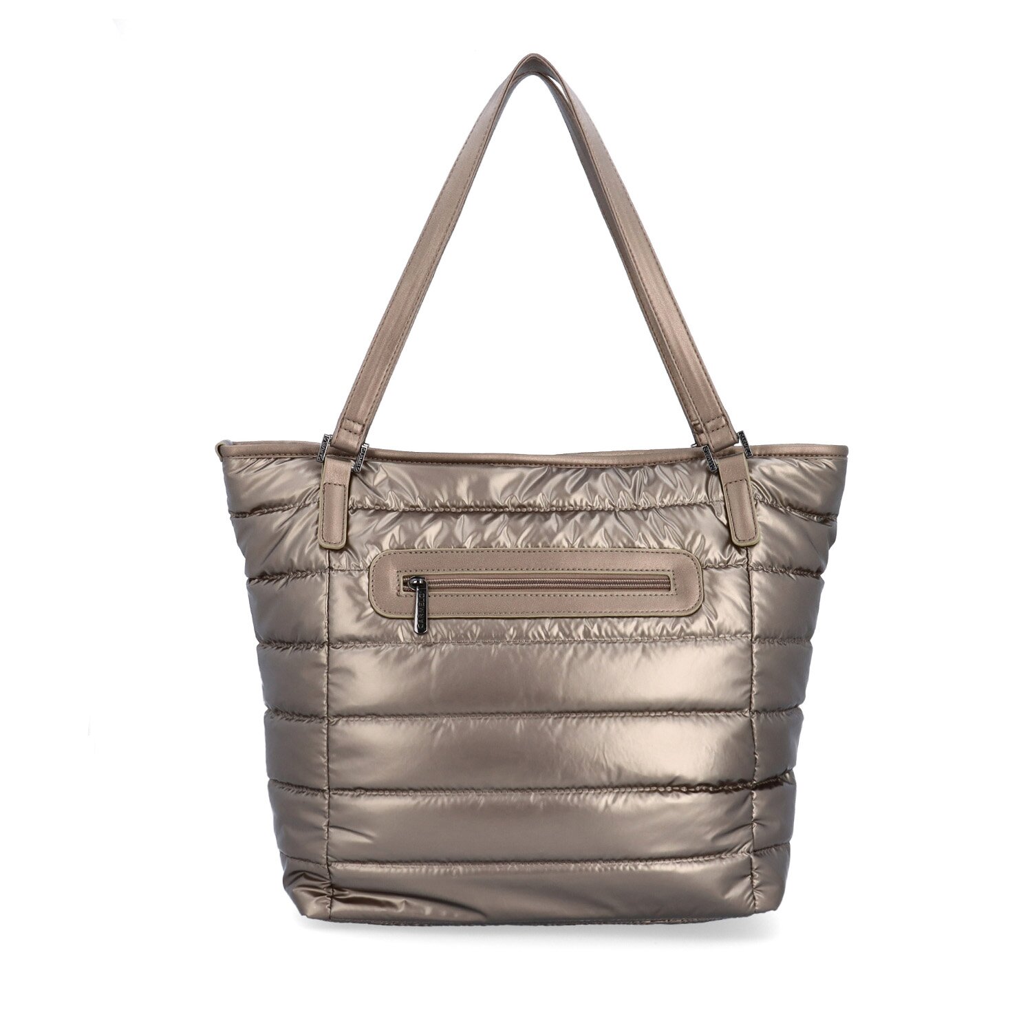 Bronzová kabelka na rameno má hlavní kapsu na zip. Je zde k dispozici vnitřní zipová kapsa na cennosti a kapsy bez zipu na drobnosti. Na zadní vnější straně kabelky je také zipová kapsa. Materiál je nylon a podšívka je textilní. Rozměry kabelky jsou 32 x 34 x 13 cm. Dokument A4 se do kabelky vejde.