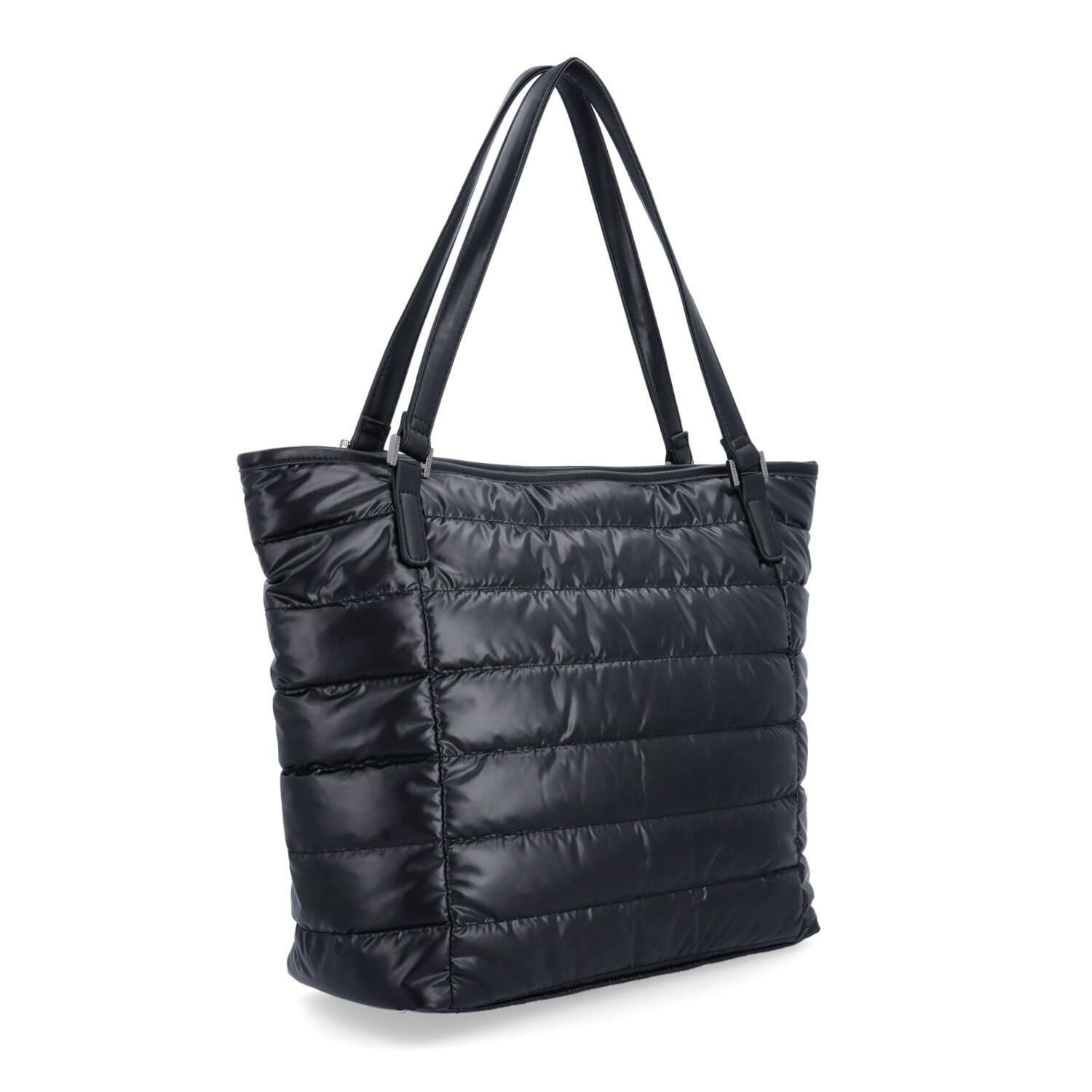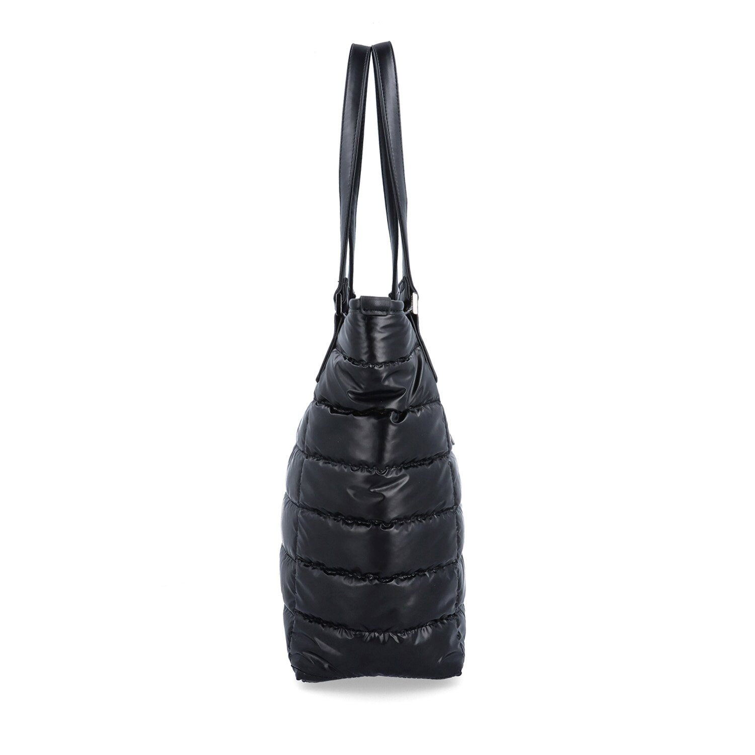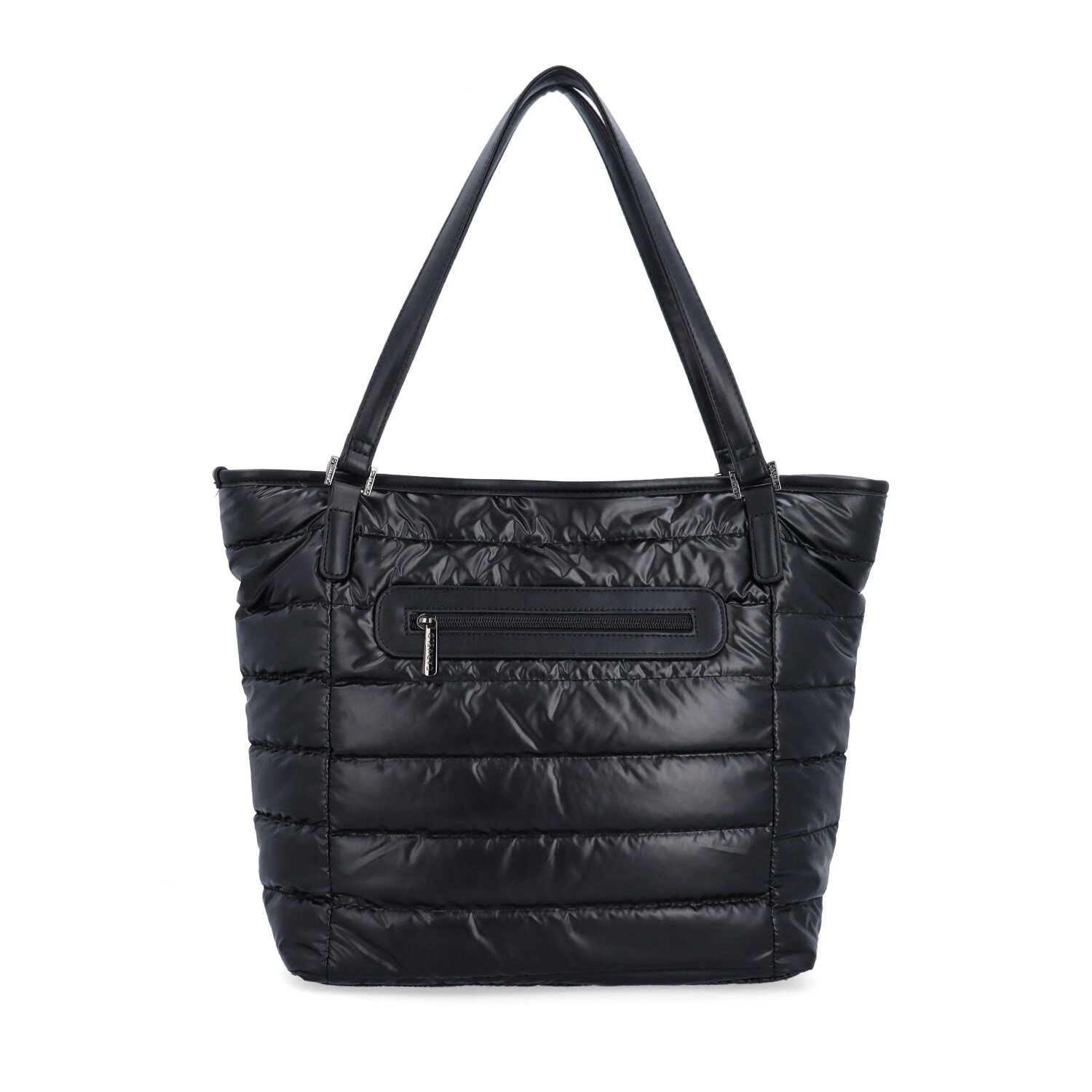 Černá kabelka na rameno má hlavní kapsu na zip. Je zde k dispozici vnitřní zipová kapsa na cennosti a kapsy bez zipu na drobnosti. Na zadní vnější straně kabelky je také zipová kapsa. Materiál je nylon a podšívka je textilní. Rozměry kabelky jsou 32 x 34 x 13 cm. Dokument A4 se do kabelky vejde.