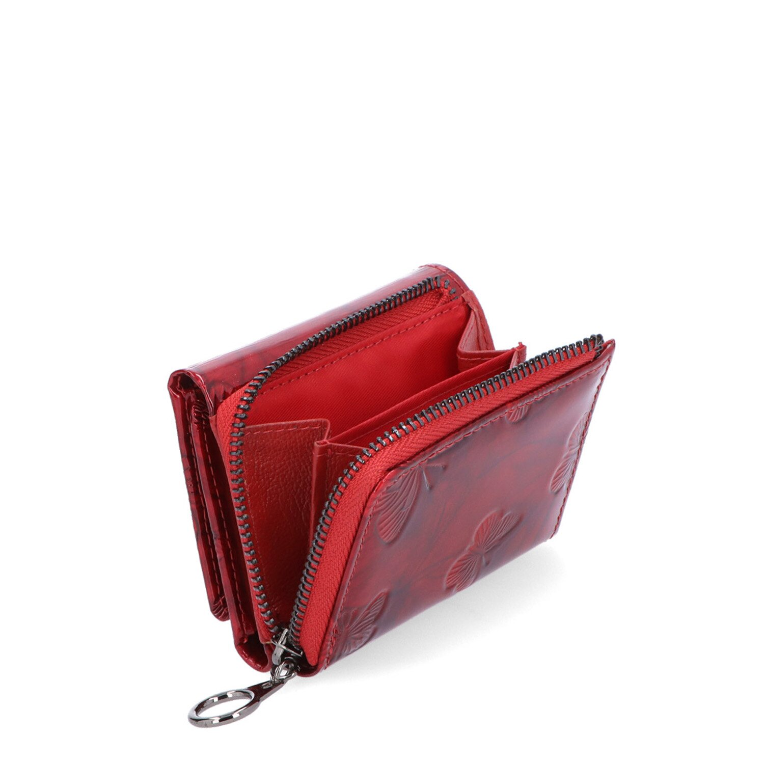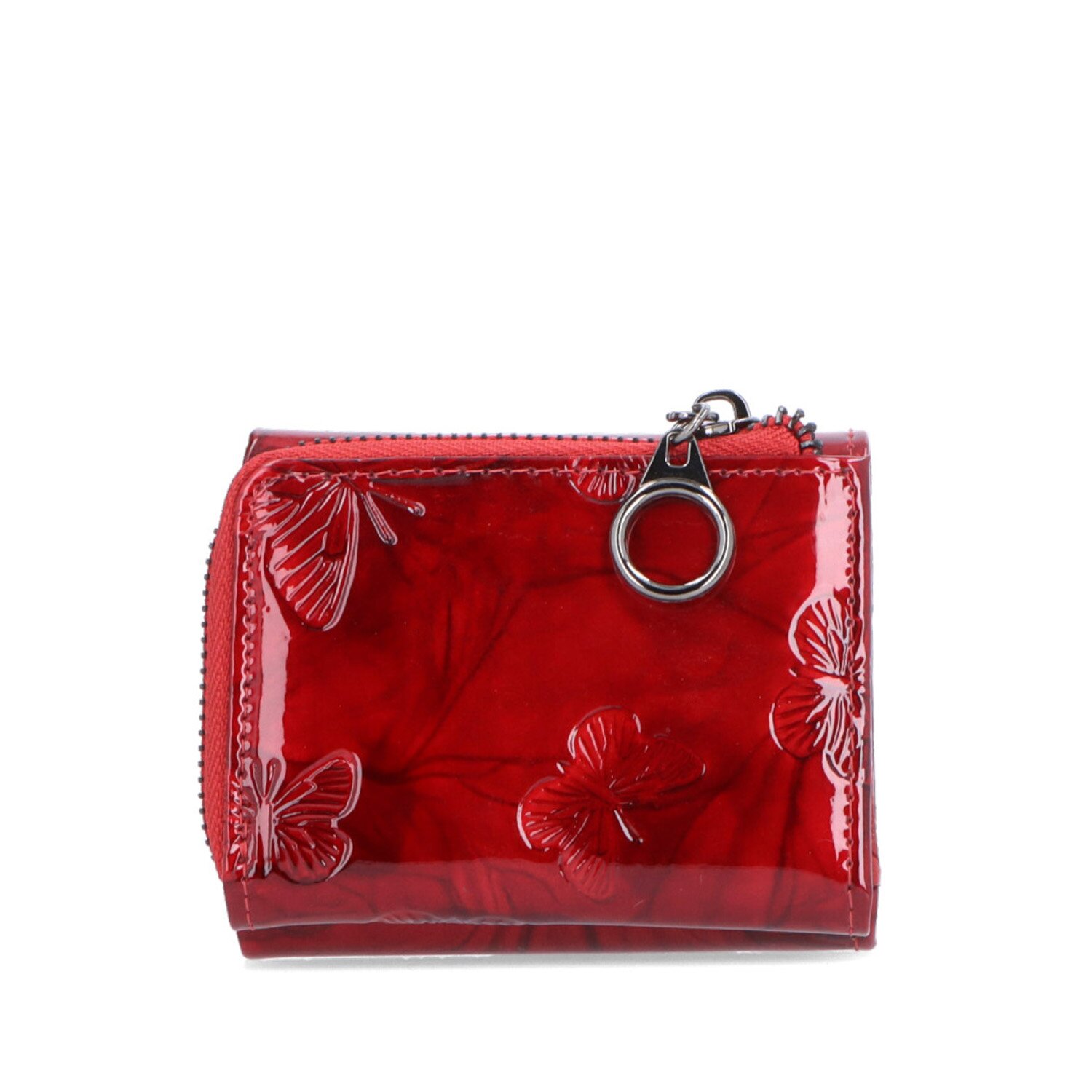 Luxusní peněženka z lakované kůže s vyraženými motýly v červené barvě. Rozměry peněženky jsou 10,5 x 8,5 x 4 cm. Peněženka obsahuje: