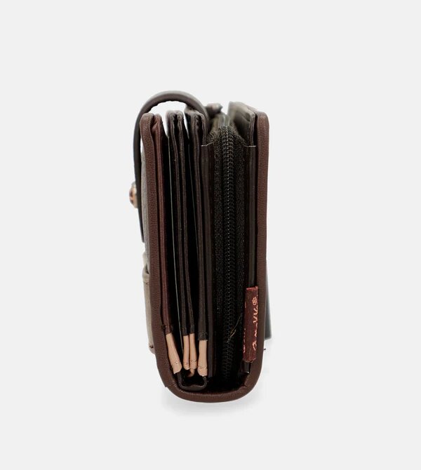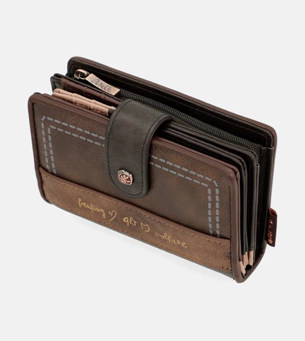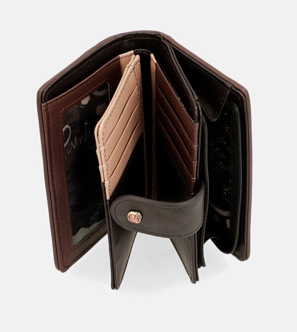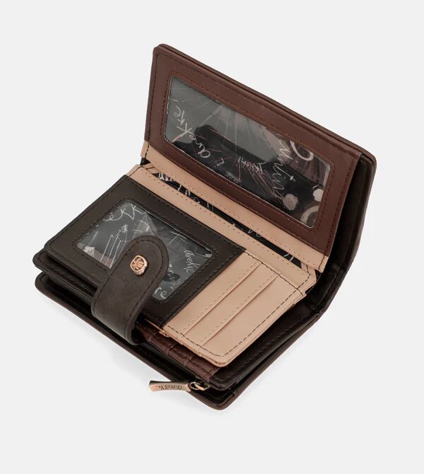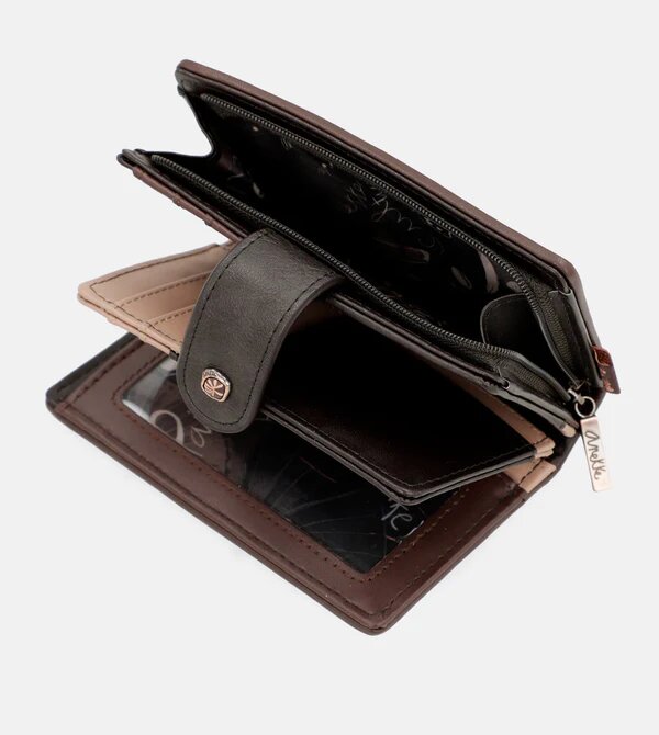 Hnědá střední peněženka má kapsu na zip na mince a pod krátkým popruhem na druk nabízí organizovaný prostor na Vaše karty a průhlednou kapsičku. V zádech peněženky je prostor na papírové peníze. Rozměry peněženky jsou 14x10x2 cm. Vnější materiál je měkký pružný polyuretan a podšívka je z polyesteru. Její kouzlo spočívá především v bezpečnostním systému RFID, který slouží k prevenci podvodných a nedobrovolných plateb, ochraně citlivých informací a zabránění krádeži osobních údajů.