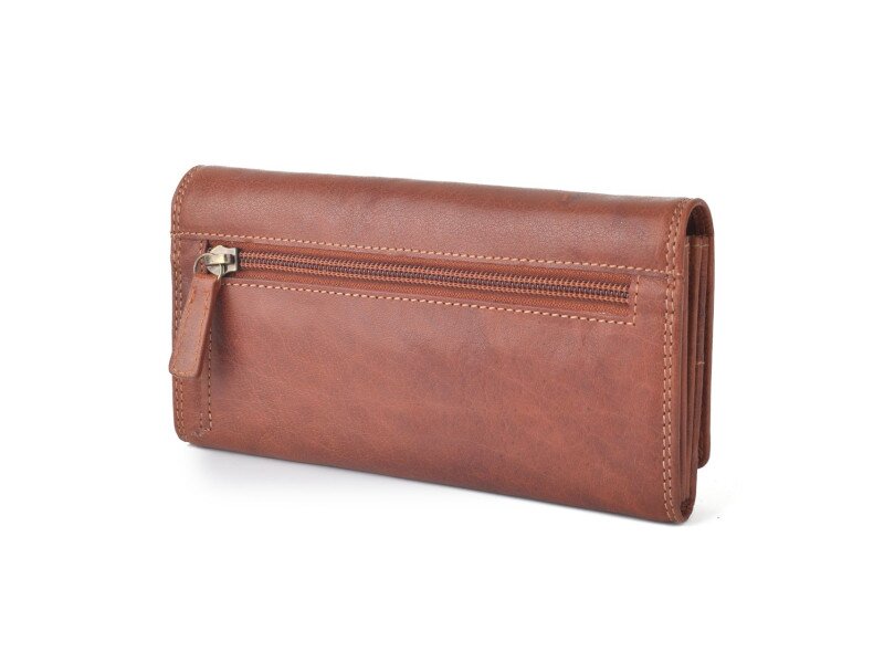 Hladká elegantní kožená dámská peněženka velkého formátu na kovový cvok v hnědé/koňakové barvě. Rozměry jsou: 19,5 x 10 x 3 cm. Peněženka disponuje: