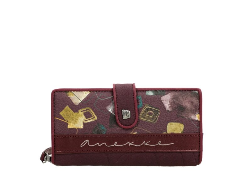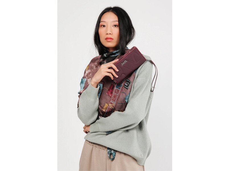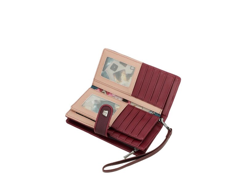 Peněženka vínové barvy. Rozměry peněženky jsou 19 x 10 x 3 cm. Vnější materiál je syntetika, podšívka je textilní a poutko je dlouhé 17 cm. Peněženka obsahuje: